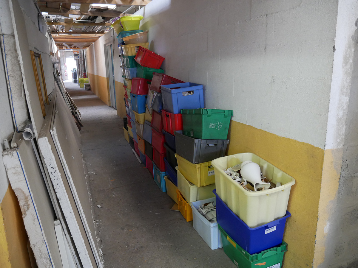 Le chantier a pris place au cœur de l'Unité, dans la cour. Au fil des jours, plusieurs postes et missions s'y sont succédé (découpe, ponçage, vitrification, assemblage, désossage et stockage des anciens meubles, documentation).