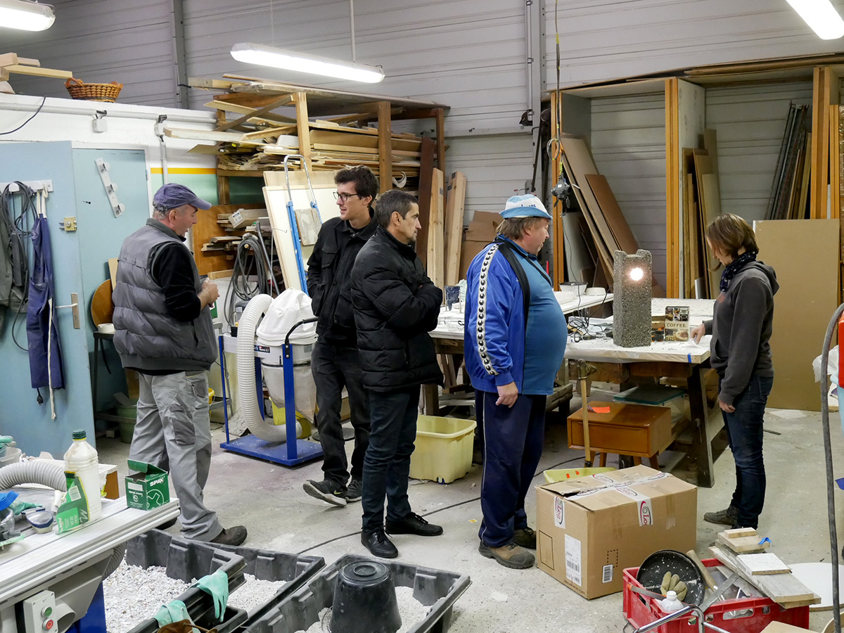 Le chantier a pris place au cœur de l'Unité, dans la cour. Au fil des jours, plusieurs postes et missions s'y sont succédé (découpe, ponçage, vitrification, assemblage, désossage et stockage des anciens meubles, documentation).