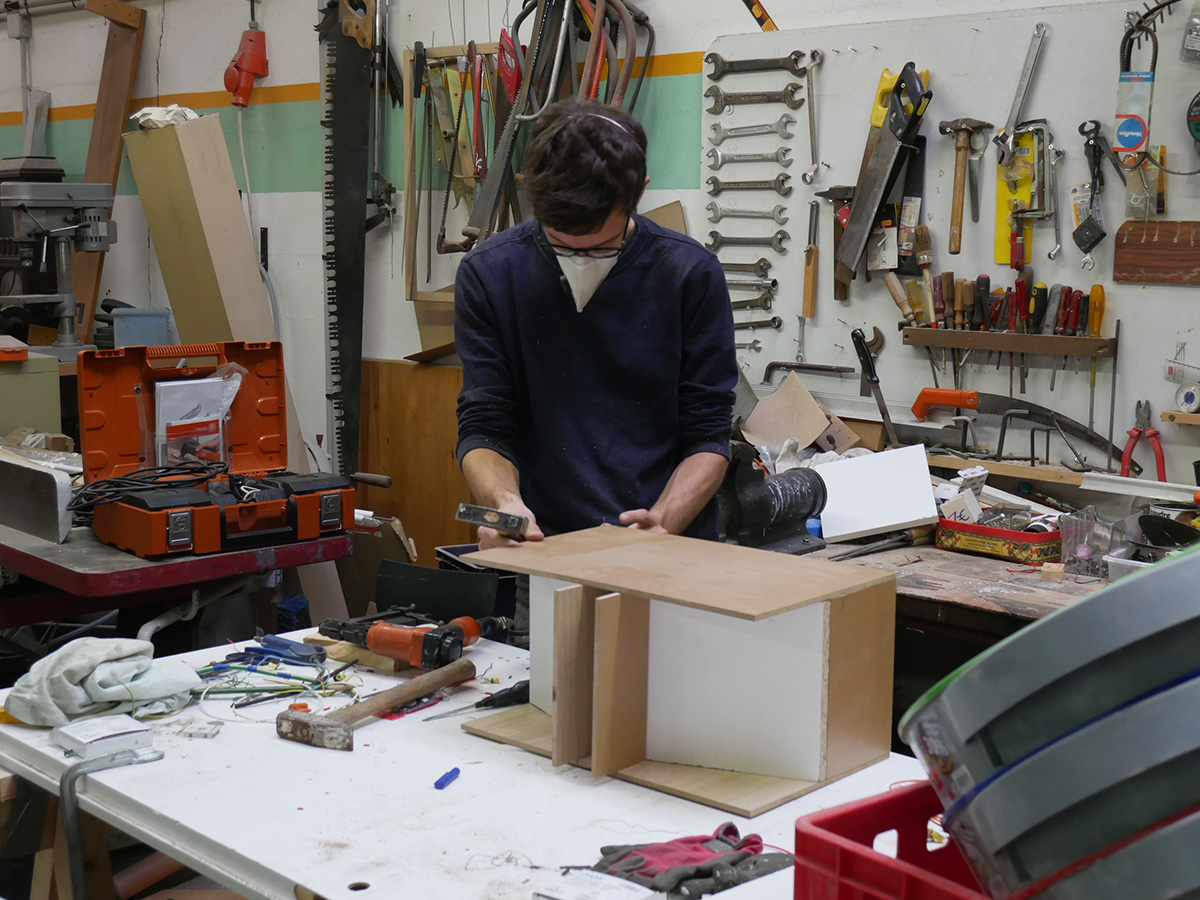 Celle-ci s’est déroulée au sein de notre atelier, à Armentières. Elle se compose de différentes étapes clés: la formalisation finale, la fabrication d’une maquette qui permettra de partager le projet à l’équipe et aux jeunes de l’UEAJ de Lens. Une fois le projet validé par toutes et tous, nous lançons l’étape de conception technique: la réalisation des plans techniques, la recherche des matériaux et fournisseurs, la préparation des protocoles de fabrication participative, la pré-fabrication de certains éléments.