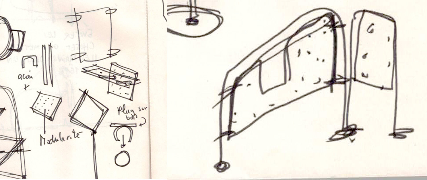 Conjuguant les envies de chacun·e et les besoins de la structure, nous avons formulé de nouveaux usages, ainsi que les objets qui y répondaient. Par le biais du dessin, de l’écrit, ou encore de la maquette, nous avons donné forme à un ensemble de mobilier: trois objets sont nés de cette phase de formalisation au sein de chaque collège.