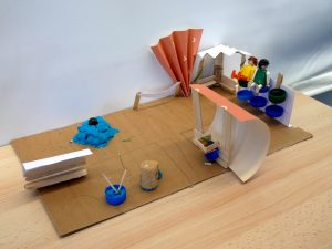 // Cette conception artistique menée en interne s'est appuyée sur la co-création engagée avec les jeunes et professionnel·le·s entre janvier et juin 2023. À travers des dessins et la fabrication d'une première maquette avec les jeunes et professionel·le·s, nous avions composé l'UEAJ du futur: trois espaces qui n'étaient pas réellement définis transformés et s'animant grâce à de nouveaux aménagements et un ensemble de mobilier supports de nouvelles actions et activités communes, basées sur les savoir-faire, sensibilités et aspirations du groupe.