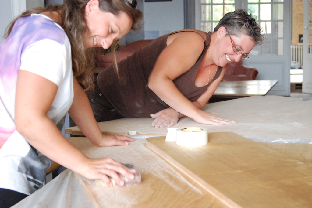 Le chantier a pris place au cœur de l'Unité, dans la cour. Au fil des jours, plusieurs postes et missions s'y sont succédé (découpe, ponçage, vitrification, assemblage, désossage et stockage des anciens meubles, documentation).
