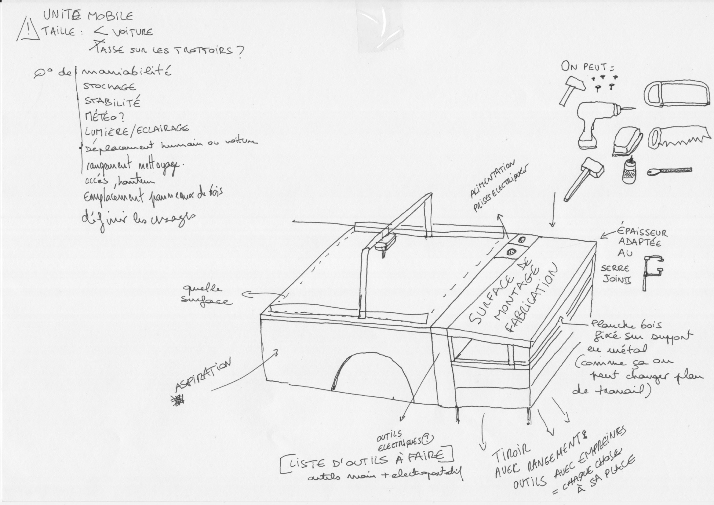 Celle-ci s’est déroulée au sein de notre atelier, à Armentières. Elle se compose de différentes étapes clés: la formalisation finale, la fabrication d’une maquette qui permettra de partager le projet à l’équipe et aux jeunes de l’UEAJ de Lens. Une fois le projet validé par toutes et tous, nous lançons l’étape de conception technique: la réalisation des plans techniques, la recherche des matériaux et fournisseurs, la préparation des protocoles de fabrication participative, la pré-fabrication de certains éléments.