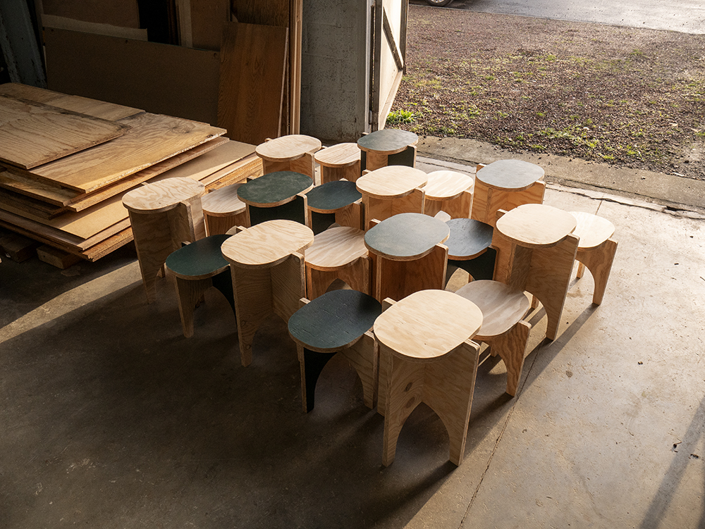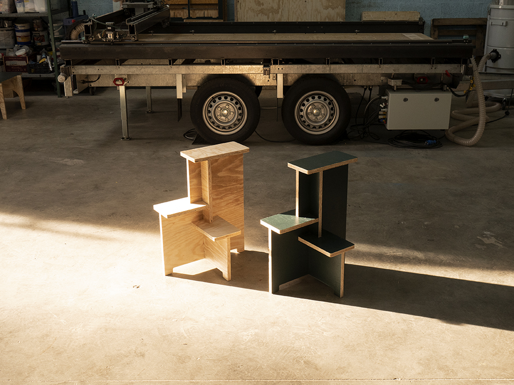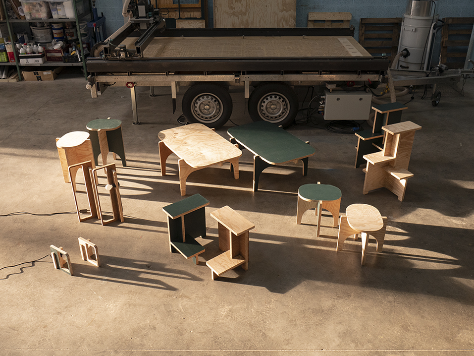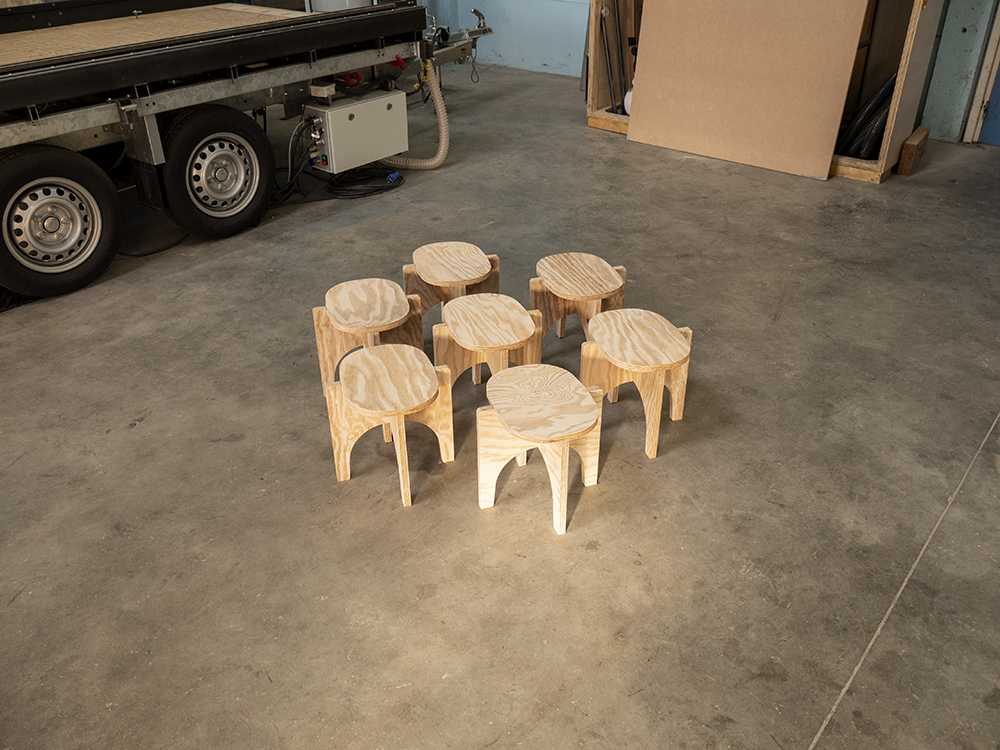Chaque objet est découpé dans du bois extrait de la filière de destruction ou d’enfouissement, grâce à La Fraise, outil de fabrication numérique que nous développons depuis 2016.