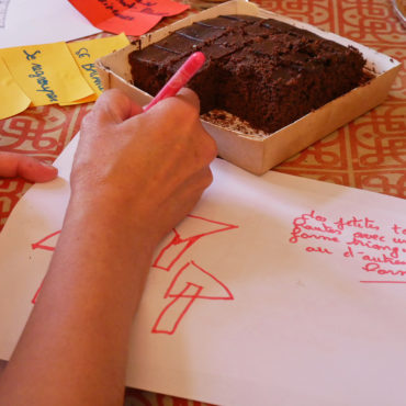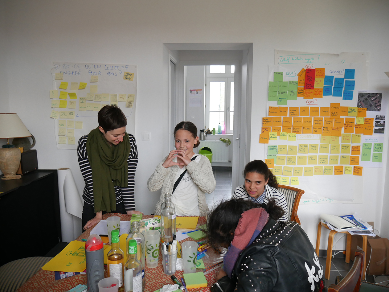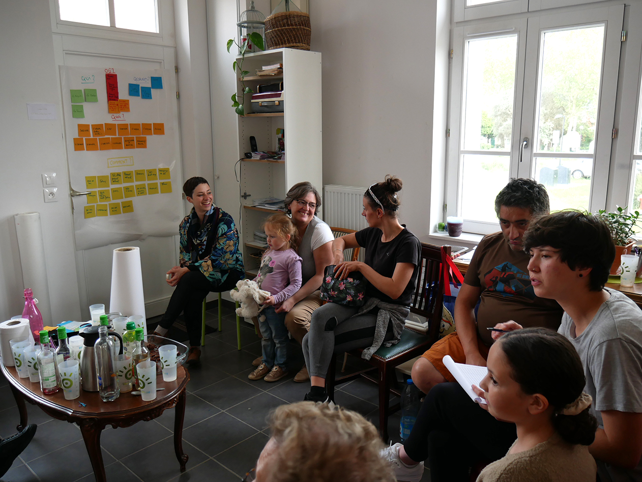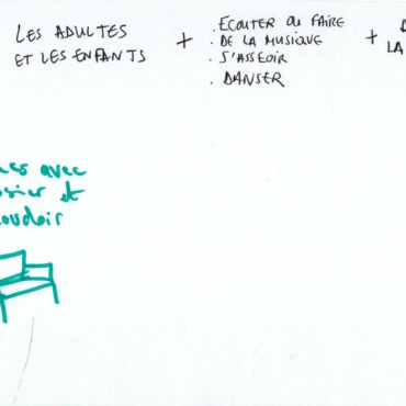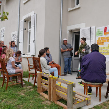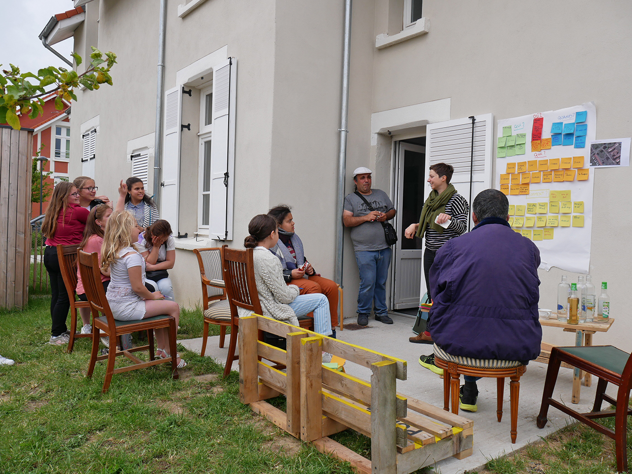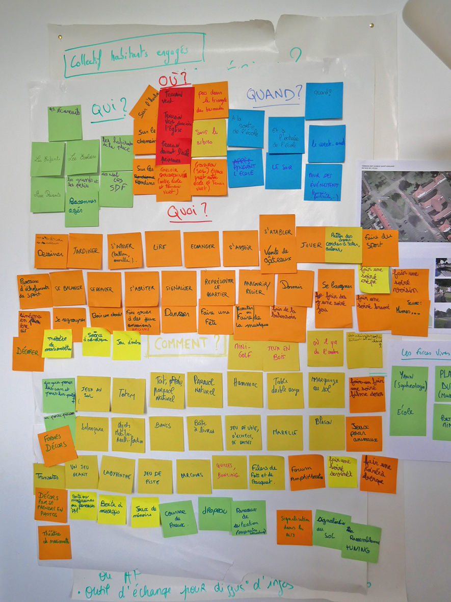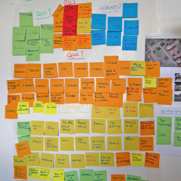 On se lance sur l’aménagement de l’espace, les mots sont lancés, tous azimuts, l’activation se veut ludique : on parle de l’envie de faire du sport, de créer des parcours (pour les humains mais aussi pour les animaux), des décors dans lesquels s’installaient et jouaient. Les personnes âgées ne sont pas oubliées et nous imaginons des jeux de mémoire, un mur d’expression sur lequel faire des concours de dessins, etc. Affaire à suivre !