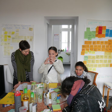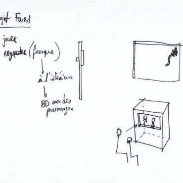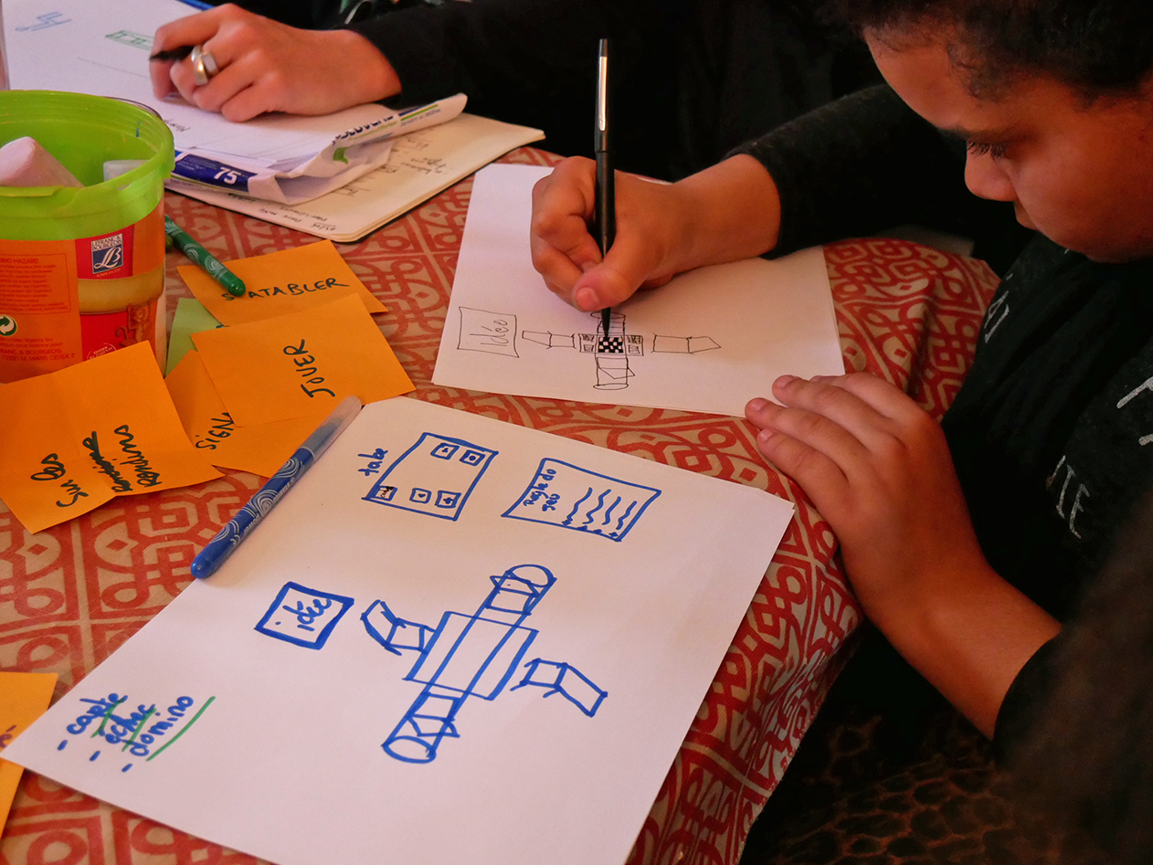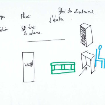 Après avoir discuté des possibilités, choisi un lieu d’investigation et d’intervention, aujourd’hui c’est parti pour la conception ! Pour la première séance de dessins on choisit de travailler en équipe – ou en solo – et de se donner des contraintes, plus précisément un scénario. Chaque équipe tire au sort un « qui », un « où » et plusieurs « quoi » (usage) que nous avions énoncés la semaine dernière.