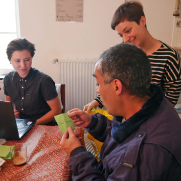 – La fine équipe (Chantal, Serge et Laetitia) va approfondir son idée de grande table pour s’attabler à plusieurs sur la place devant l’école. Ils définissent aussi des plus petites tables, des « mange-debout » qui ponctueraient l’espace.