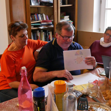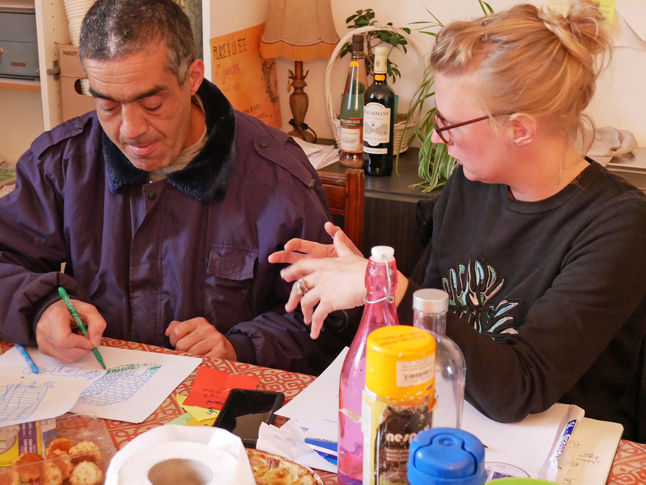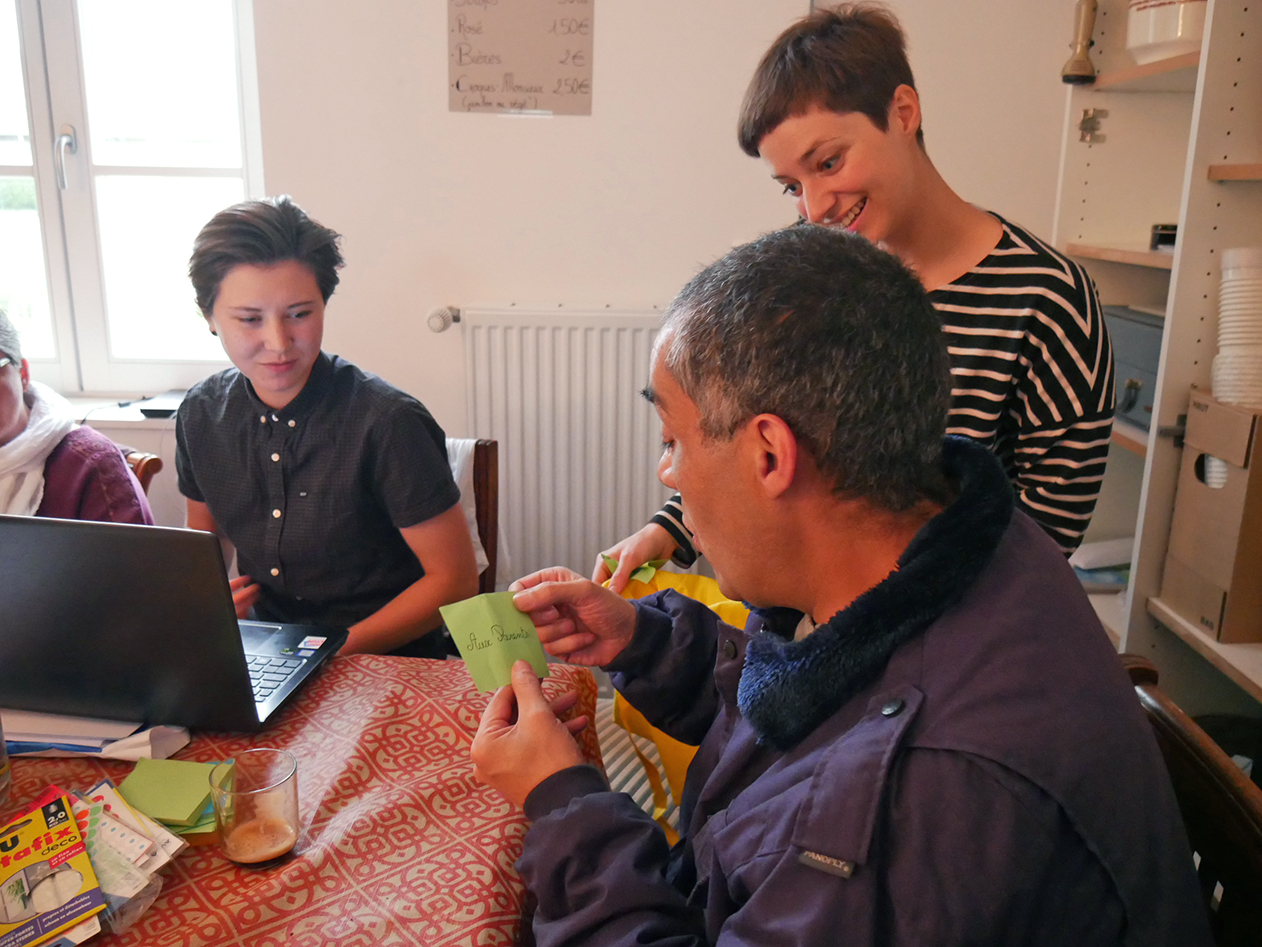 – Bernadette, Anne-Marie, Fabrice et Pascal se lancent dans une réflexion autour d’un aménagement ludique de l’espace vert en tirant les actions suivantes : se regrouper, jouer, tracer au sol, se réunir, etc.