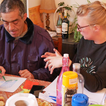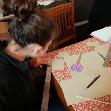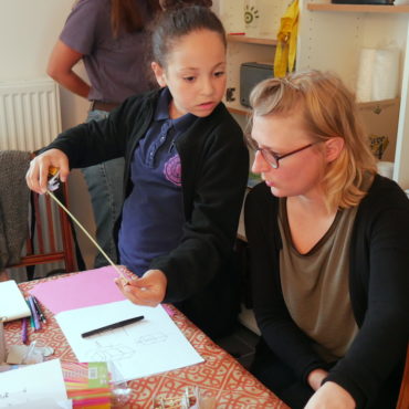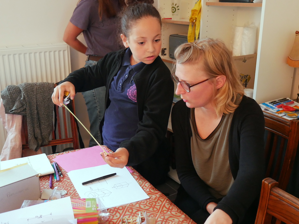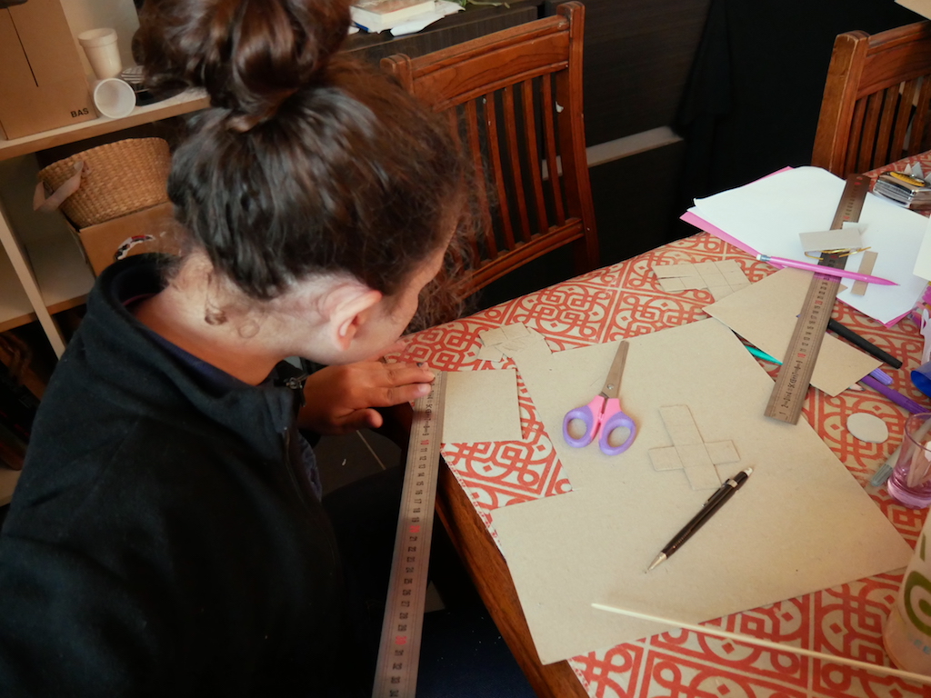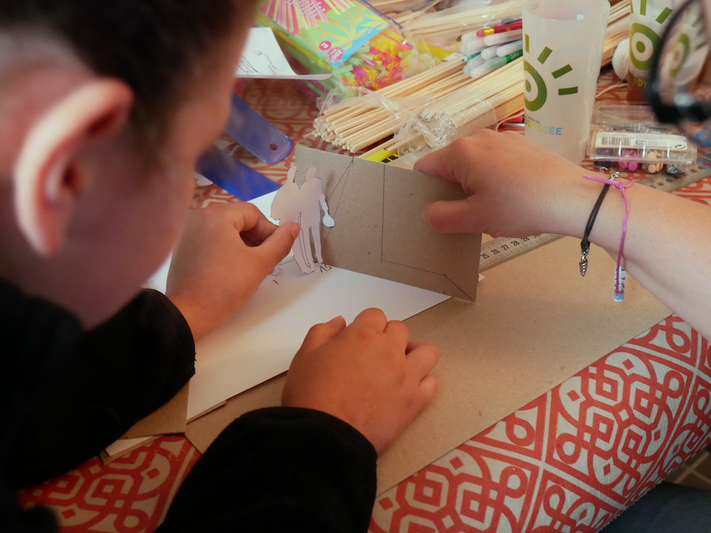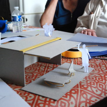 – Laetitia, rejointe par Zaïna, inventent un dispositif de jeu fonctionnant avec des volets à associer différemment pour construire et déconstruire des formes.
