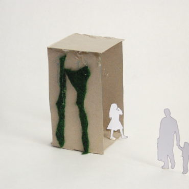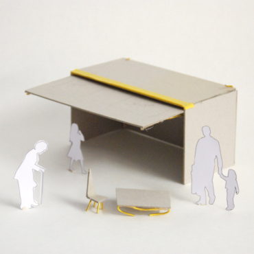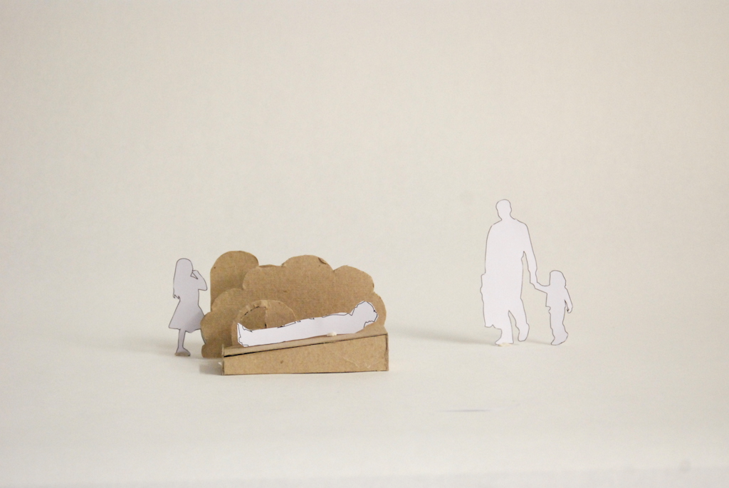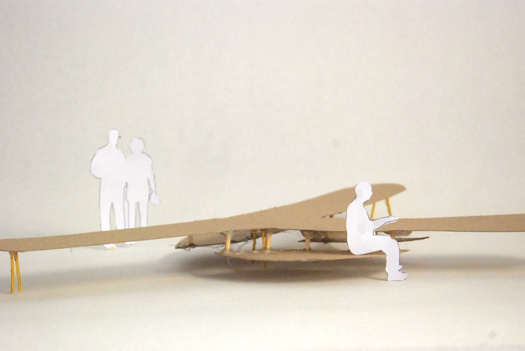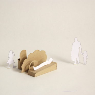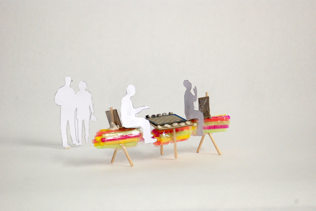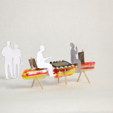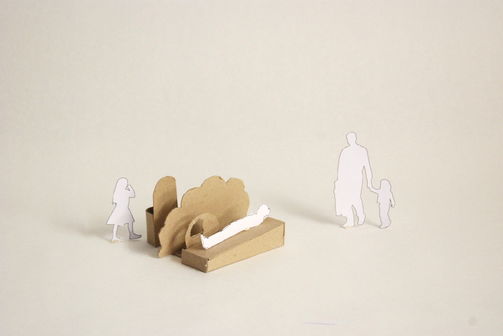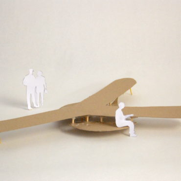 - un transat et une poubelle insérés dans un décors de strates qui créent un effet visuel de profondeur. Il y a des percées pour regarder à travers, se cacher, etc. > idées centrales : visuel, ludique, une liberté d’usage, écologique.