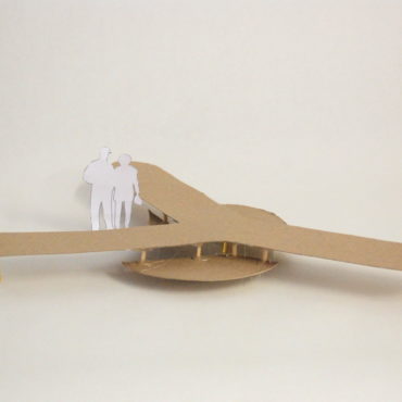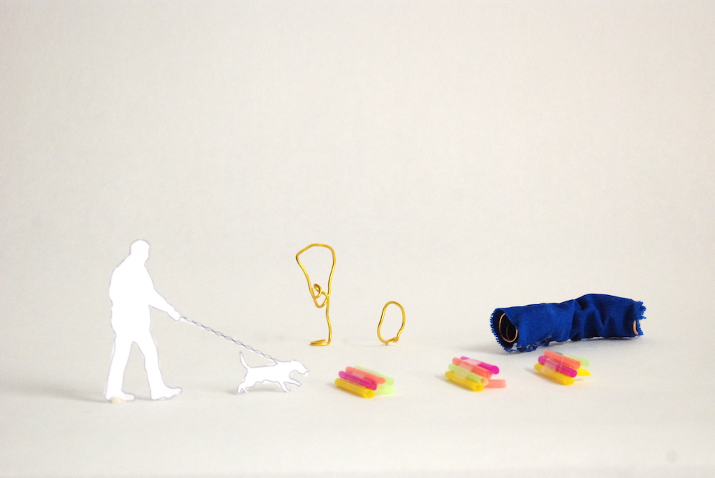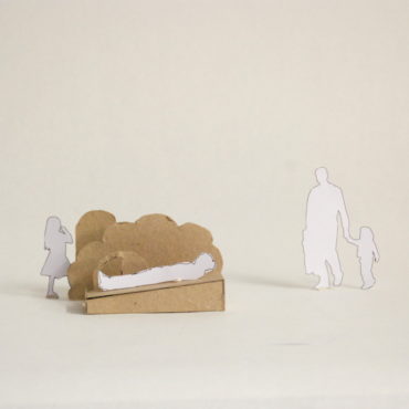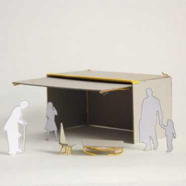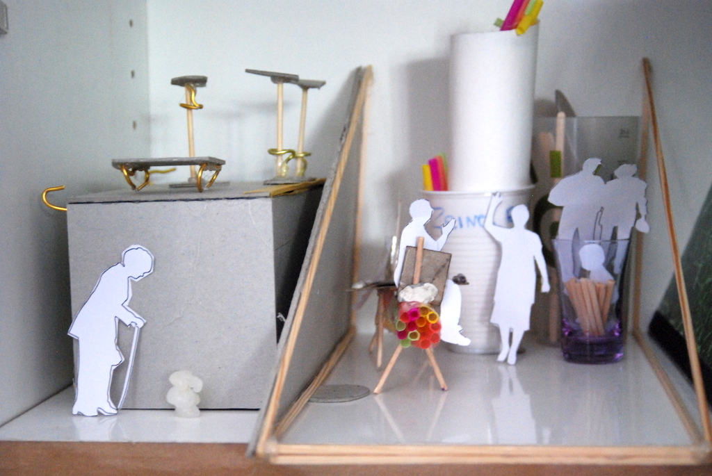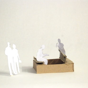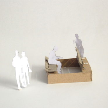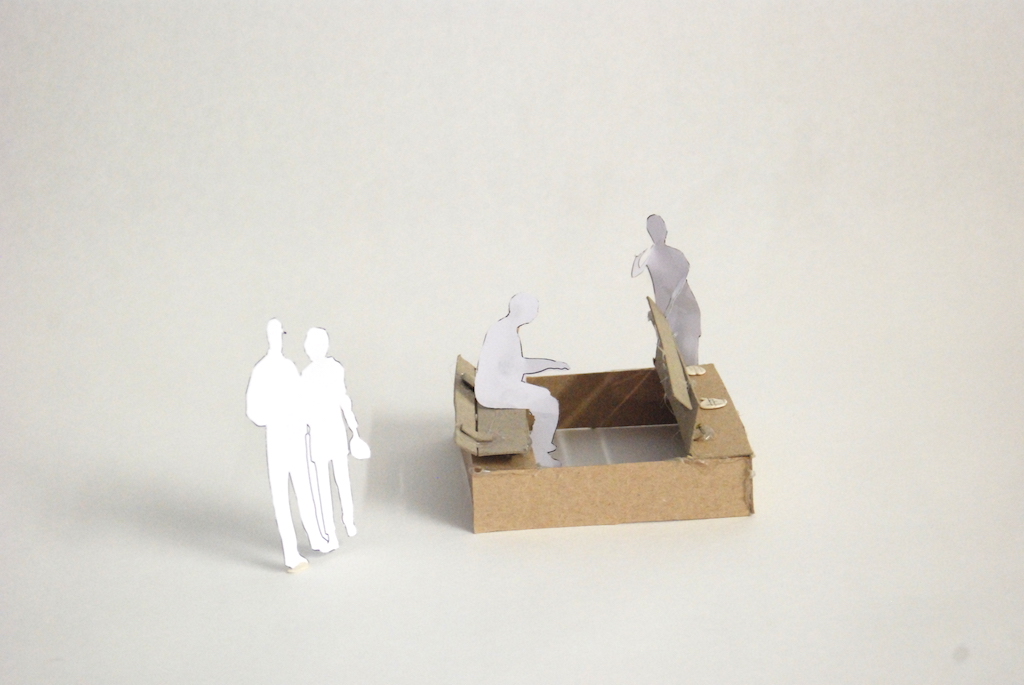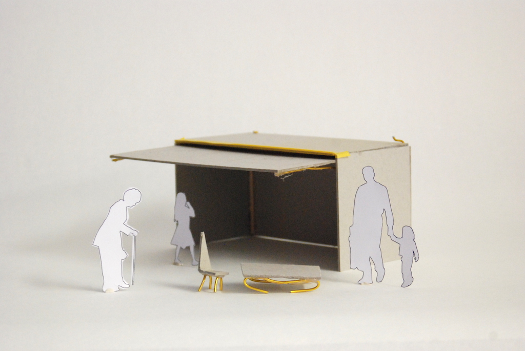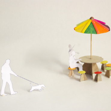 - un transat et une poubelle insérés dans un décors de strates qui créent un effet visuel de profondeur. Il y a des percées pour regarder à travers, se cacher, etc. > idées centrales : visuel, ludique, une liberté d’usage, écologique.