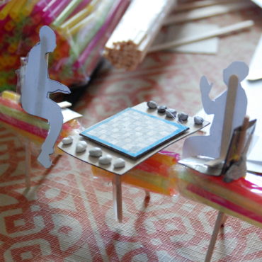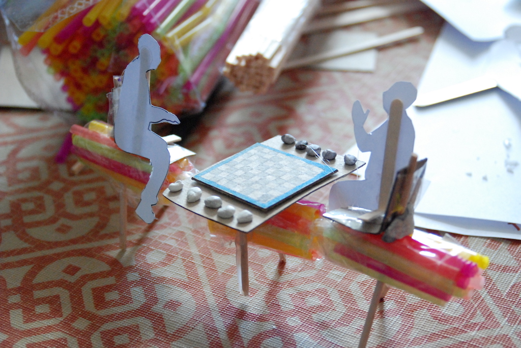– Amandine peaufine sa maquette de table tournante avec tabourets tournants (se balancer et s’attabler).