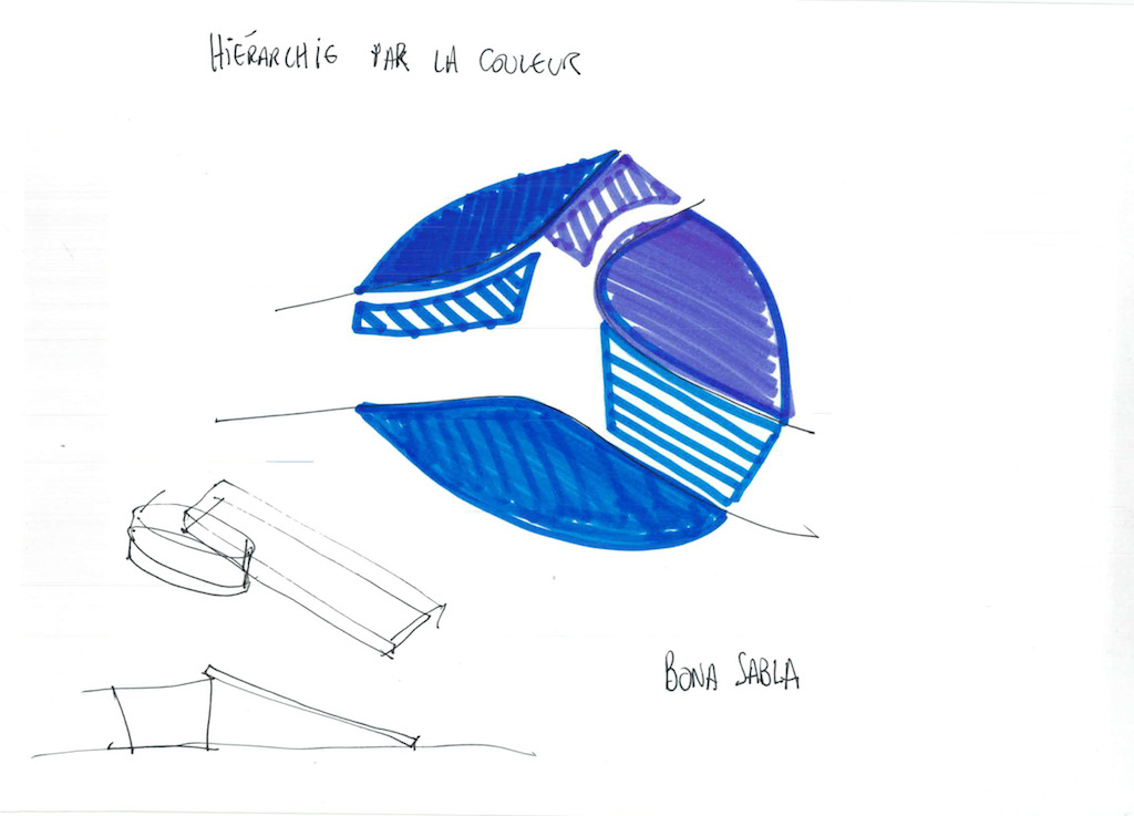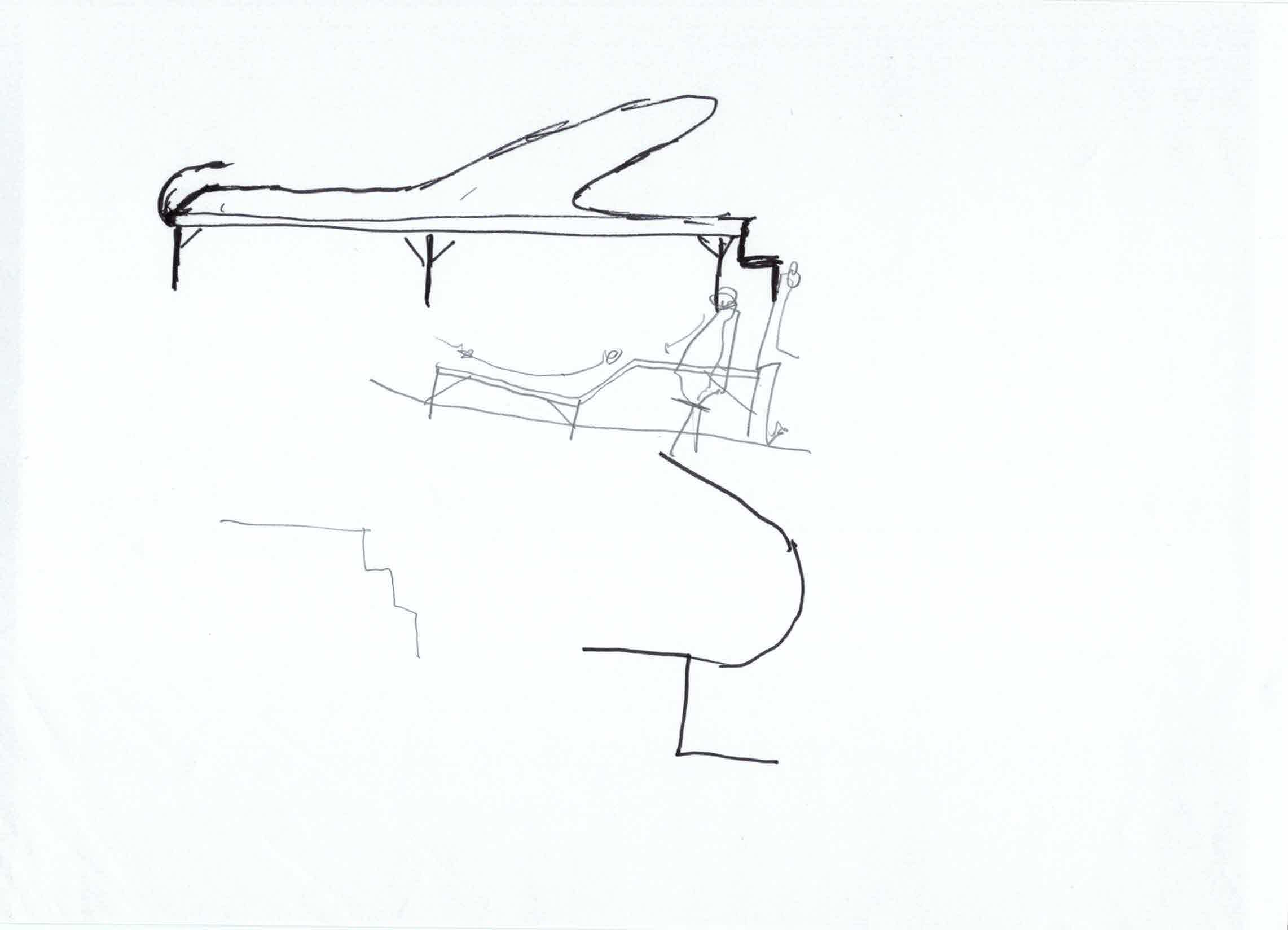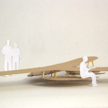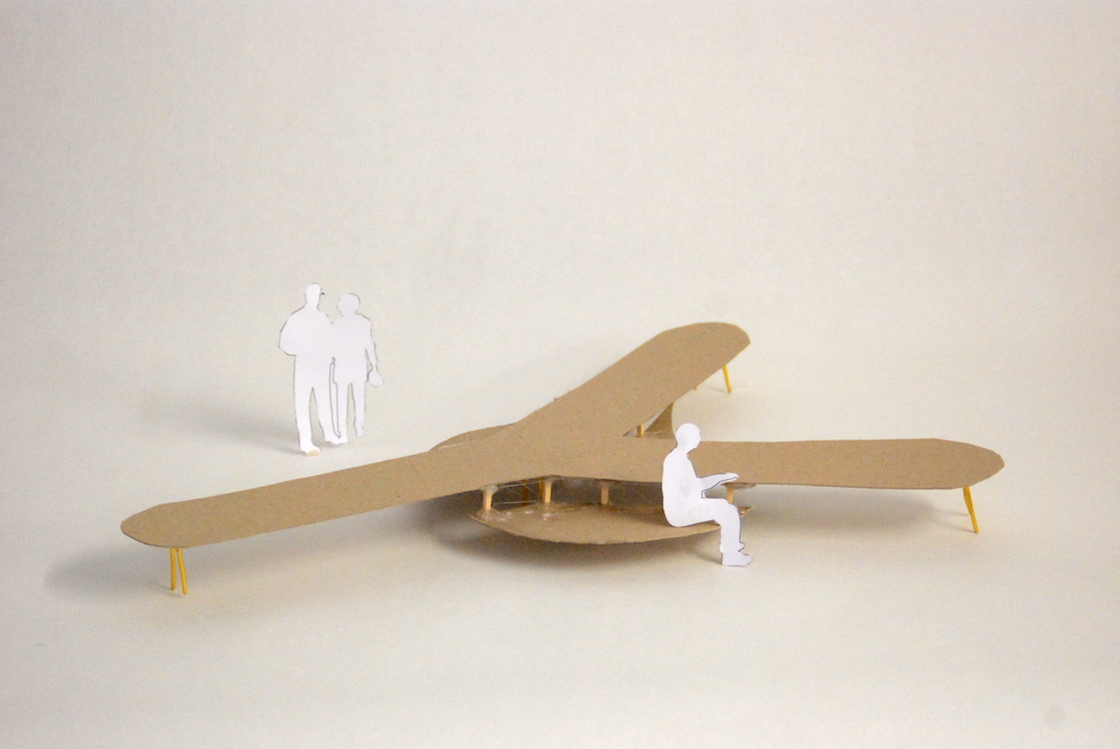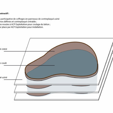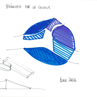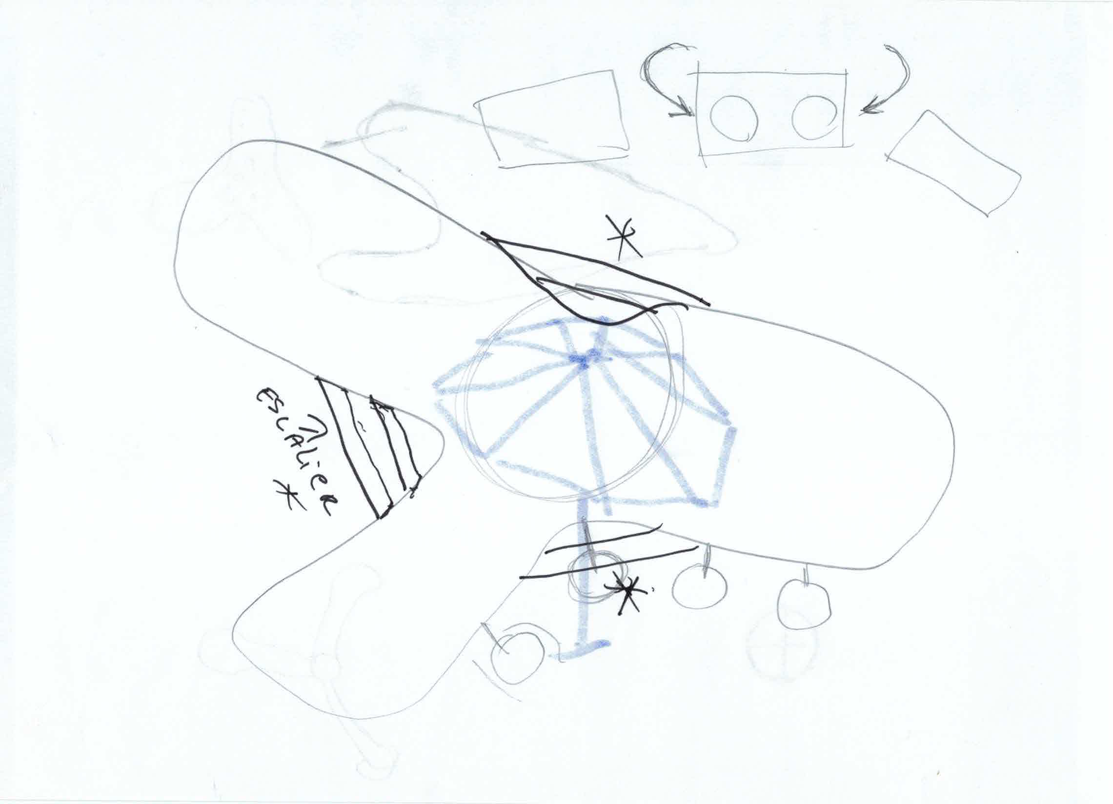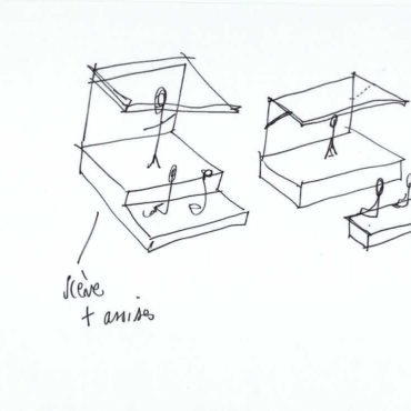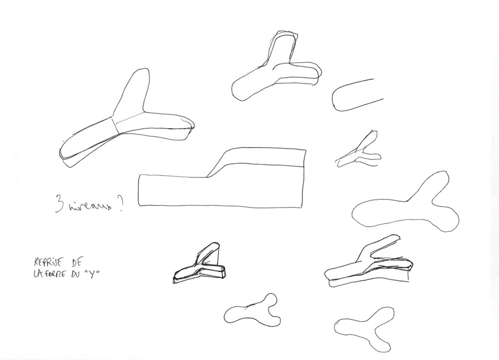 - une grande plate-forme multifonction en « Y » avec différents niveaux, qui pourrait servir de table (chacun pourrait ramener sa chaise), d’assise, de podium, etc.) > idées centrales : la convivialité, le partage, une liberté d’usage