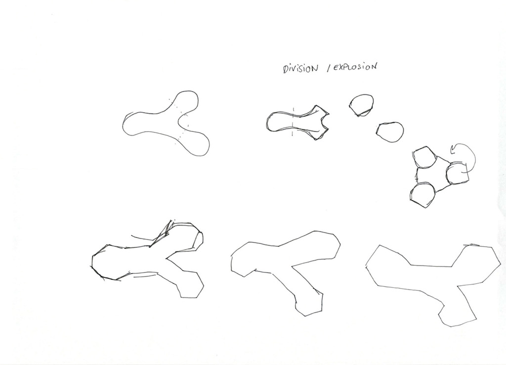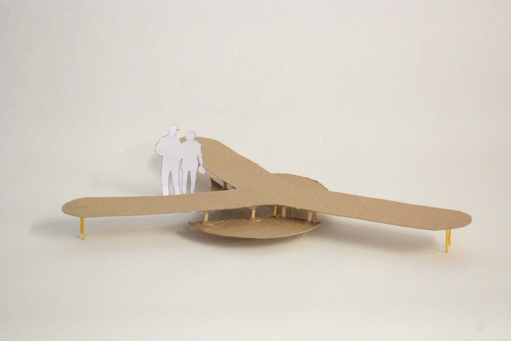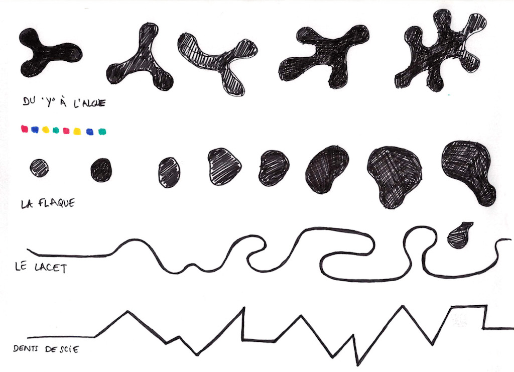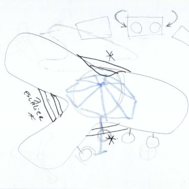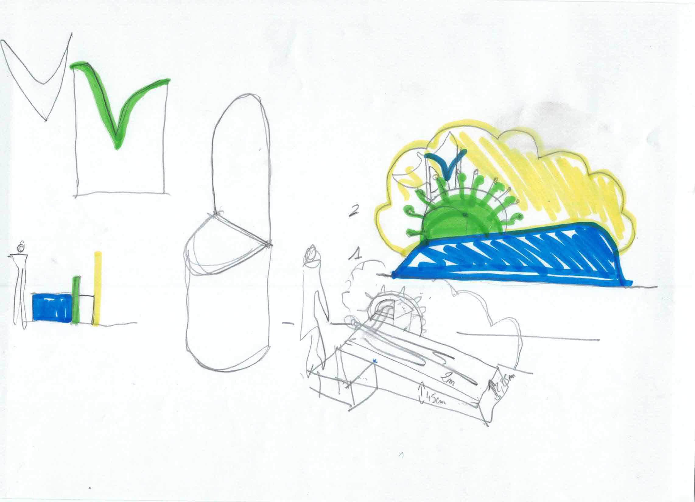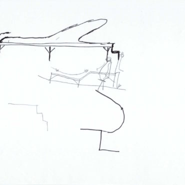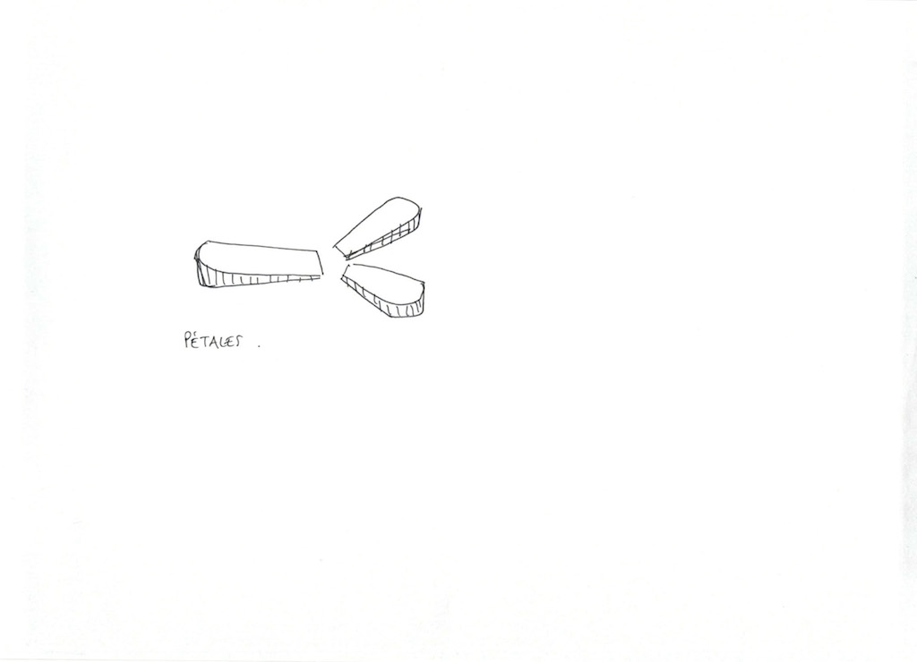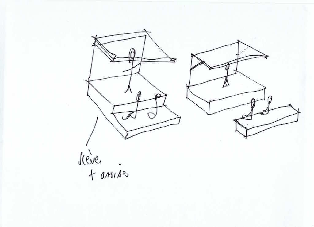 - une grande plate-forme multifonction en « Y » avec différents niveaux, qui pourrait servir de table (chacun pourrait ramener sa chaise), d’assise, de podium, etc.) > idées centrales : la convivialité, le partage, une liberté d’usage