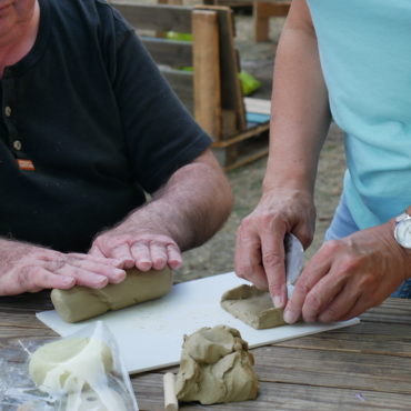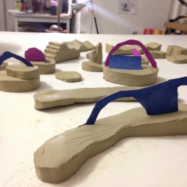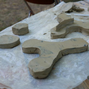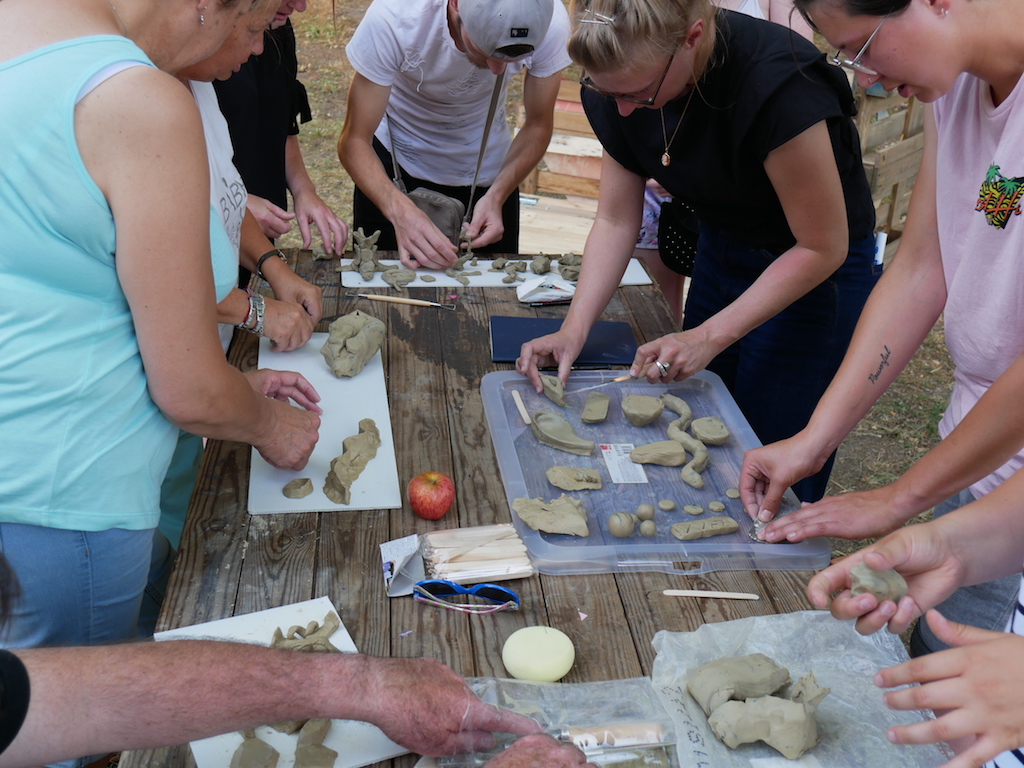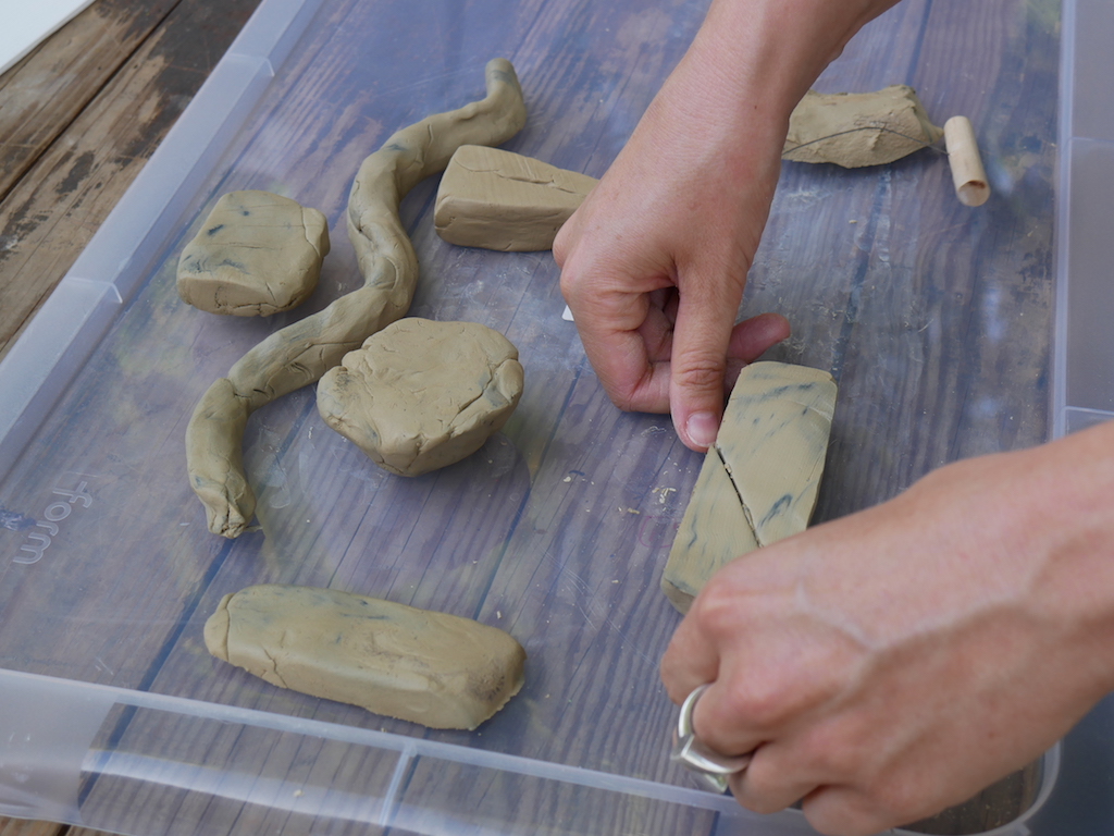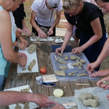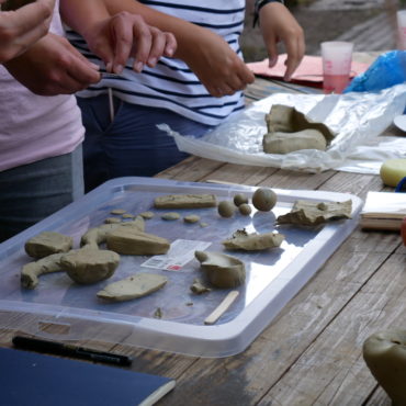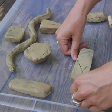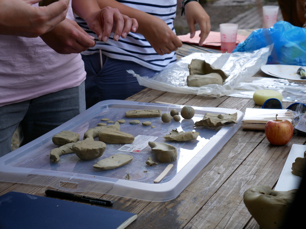 Durant ce dernier atelier, nous nous attachons à déterminer l’aspect formel et esthétique de l’installation. Quelles formes pour les volumes, le graphisme au sol, le lien entre les deux, etc. Pour cela, rien de mieux que la terre pour modeler nos idées !