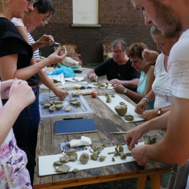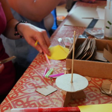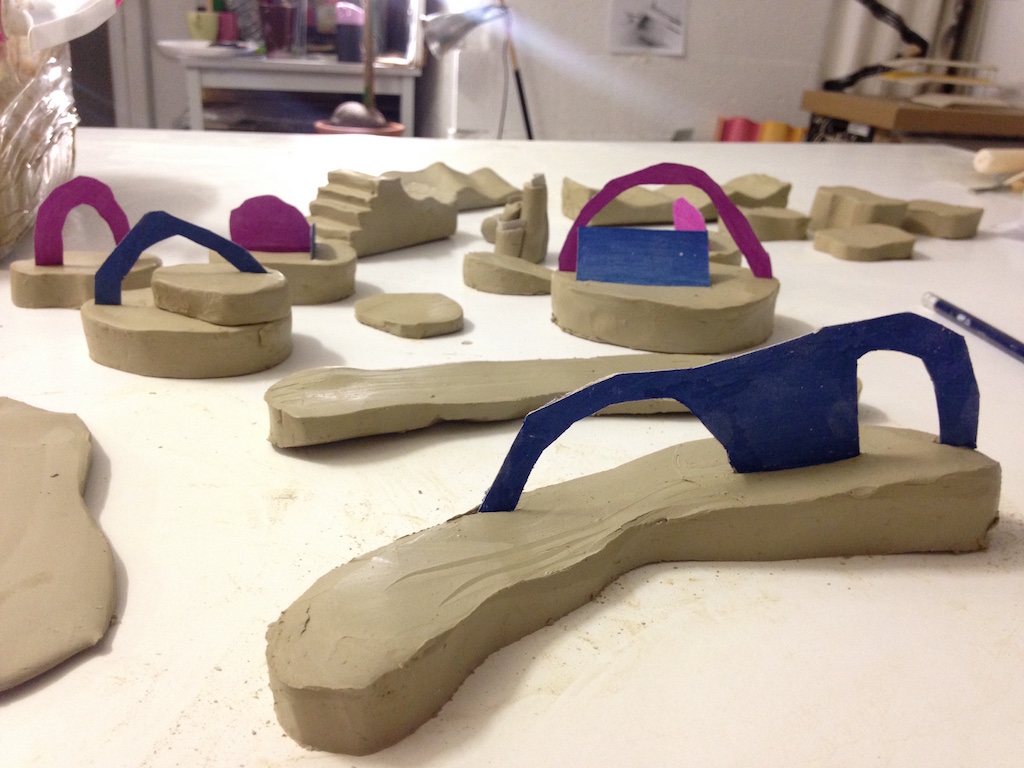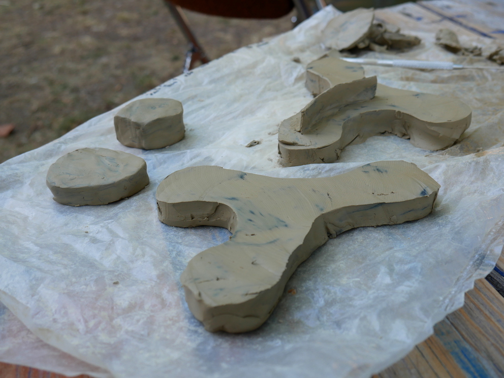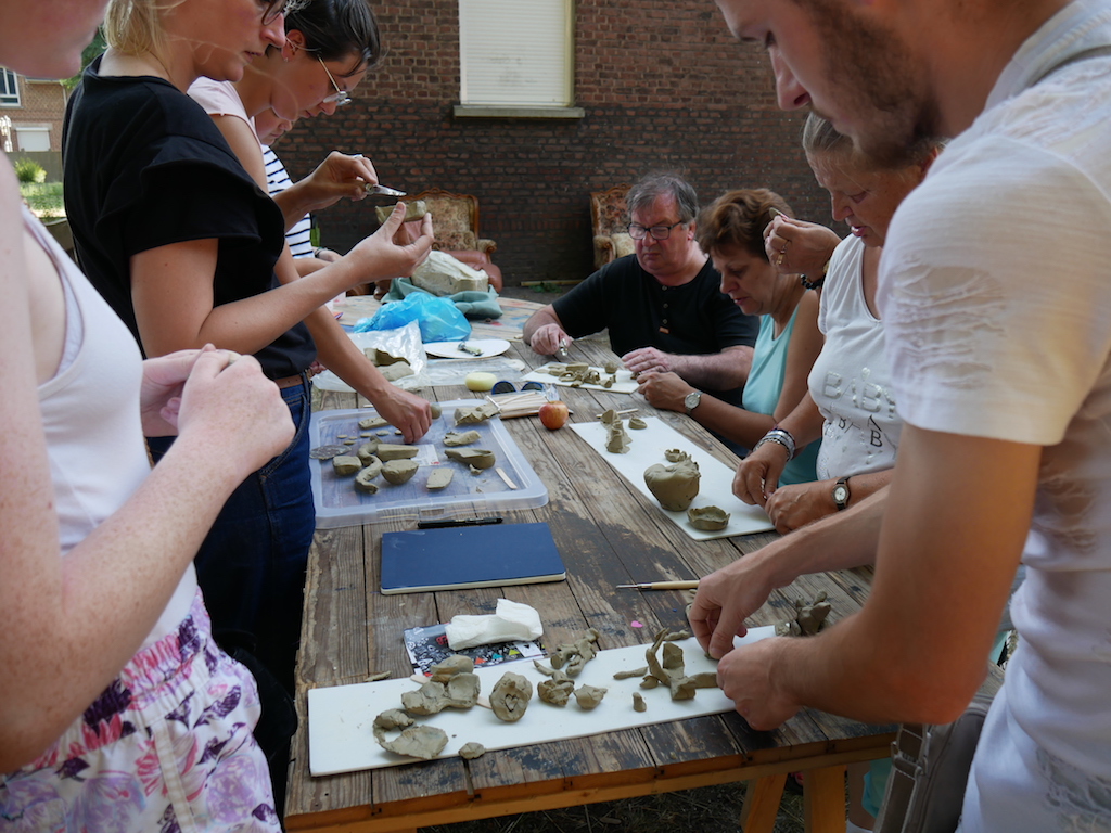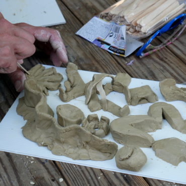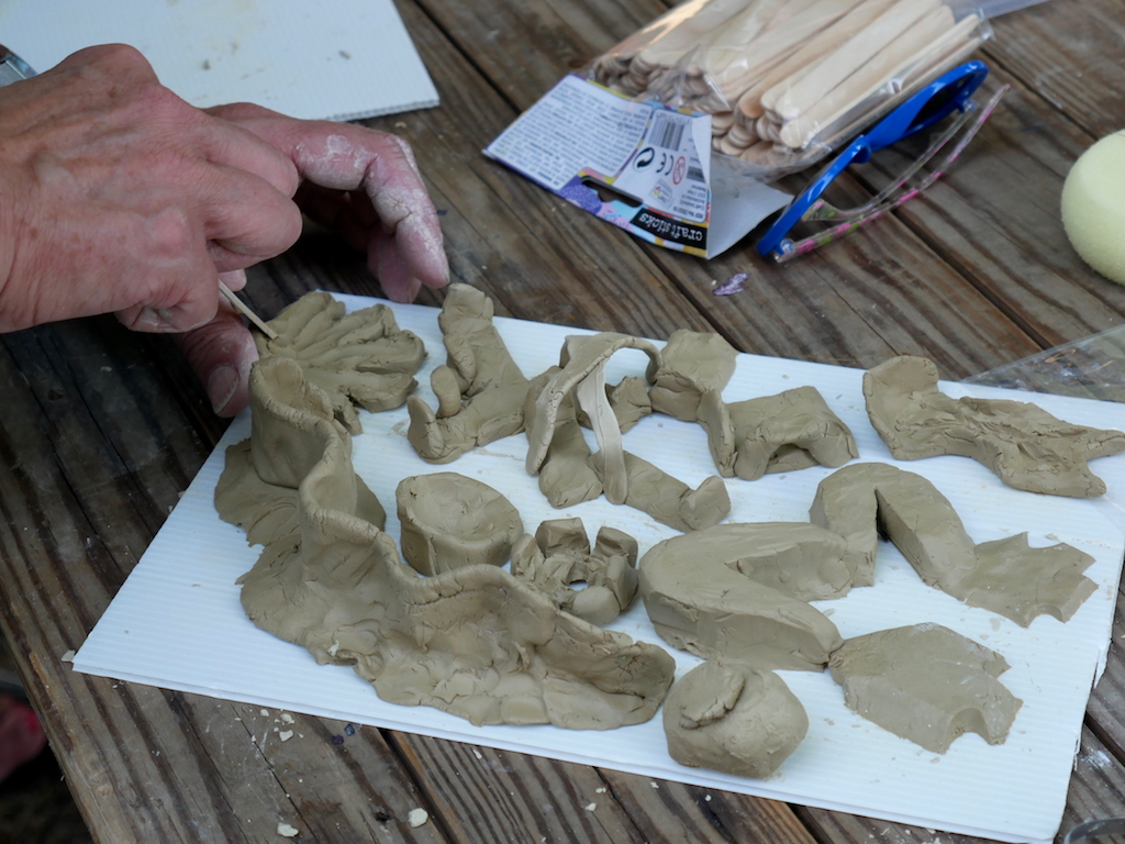 Durant ce dernier atelier, nous nous attachons à déterminer l’aspect formel et esthétique de l’installation. Quelles formes pour les volumes, le graphisme au sol, le lien entre les deux, etc. Pour cela, rien de mieux que la terre pour modeler nos idées !