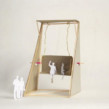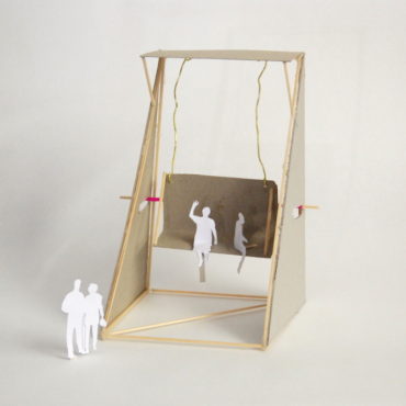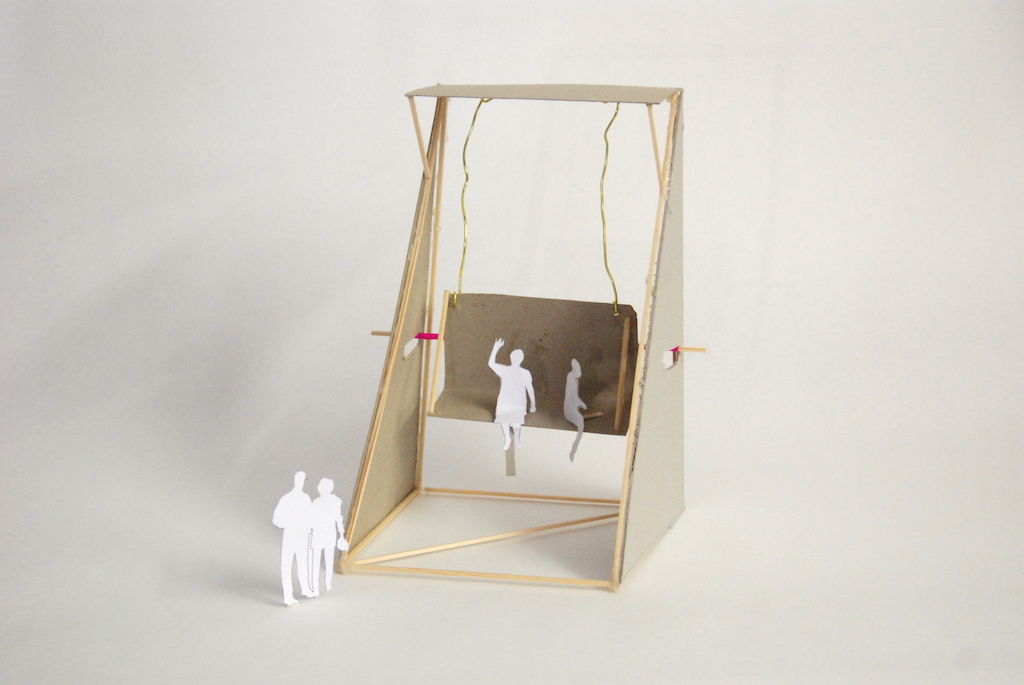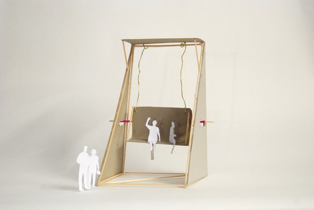 - une balancelle sur-dimensionnée, pour perturber le regard, faire signalétique et retourner en enfance. > idées centrales : visibilité, ludique pour les enfants et les grands, se retrouver.