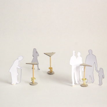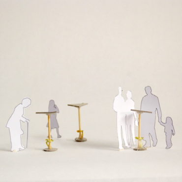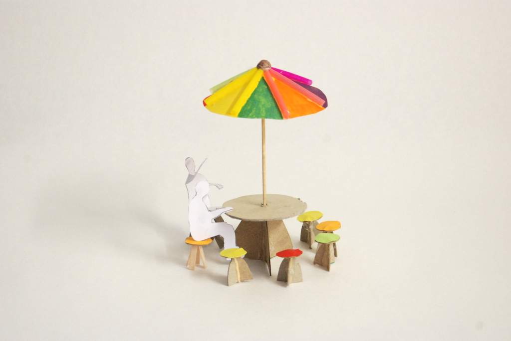 - une table ronde, surmontée d’un parasol, dont le plateau peut tourner pour échanger de plats ou pour faciliter les déplacements sur les jeux de plateau. Les assises tournent également pour pouvoir se balancer. > idées centrales : convivialité, partage, signalétique, ludique.