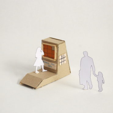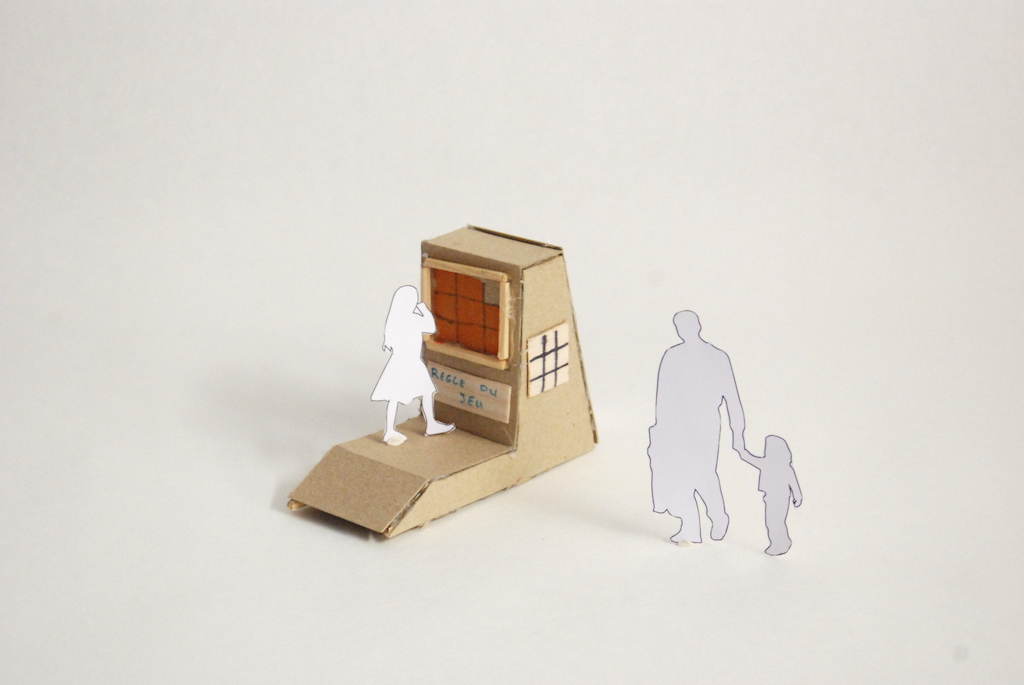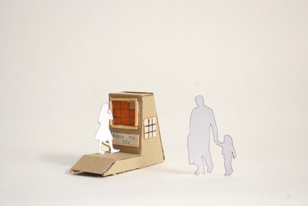 - un petit théâtre de marionnettes/ d’ombres, pour improviser des représentations, se raconter des histoires. On peut s’y cacher et sur un des pans des percées permettent d’y passer la tête. > idées centrales : jeu, spectacle, ludique, liberté d’usage
