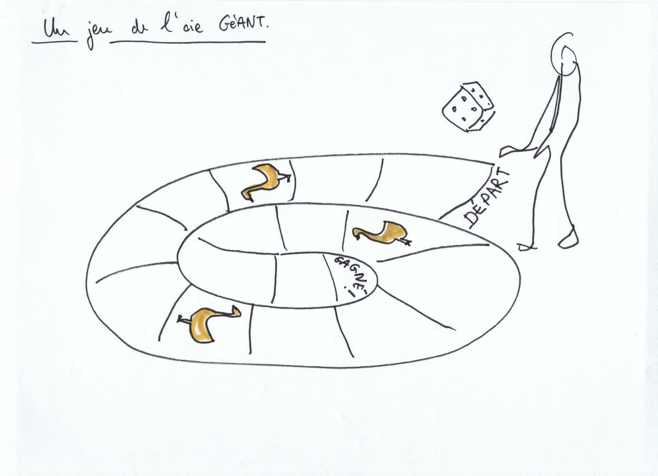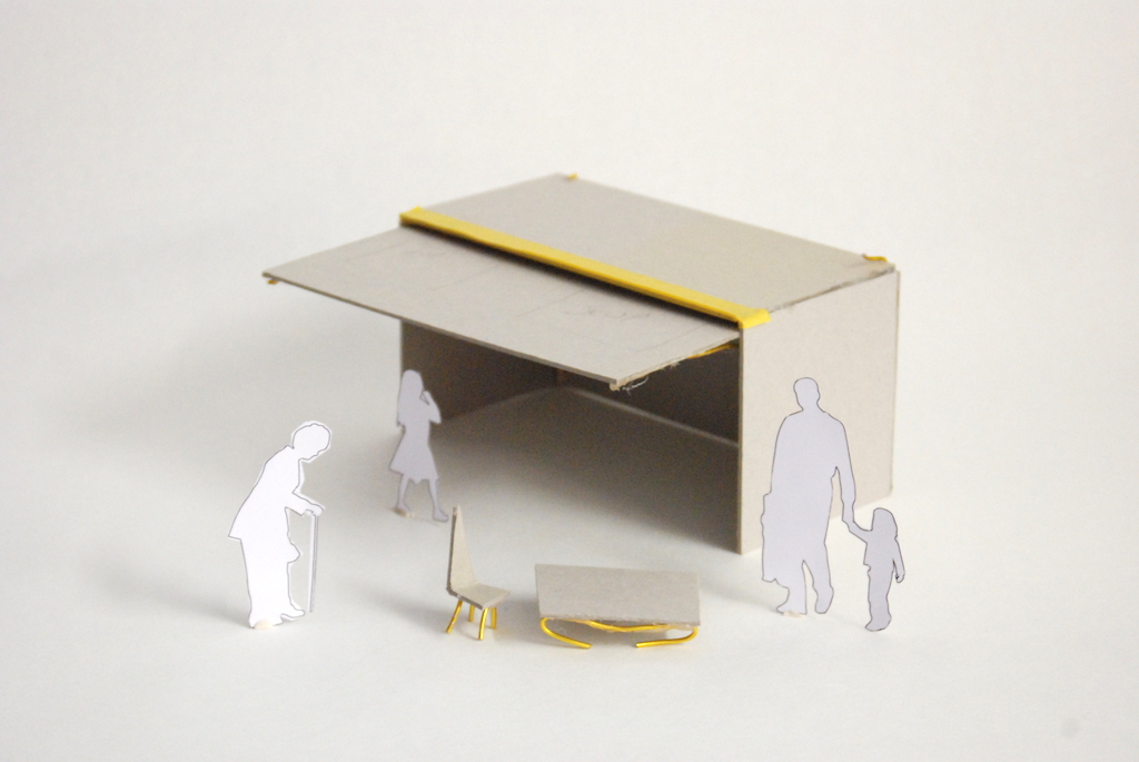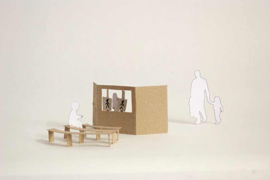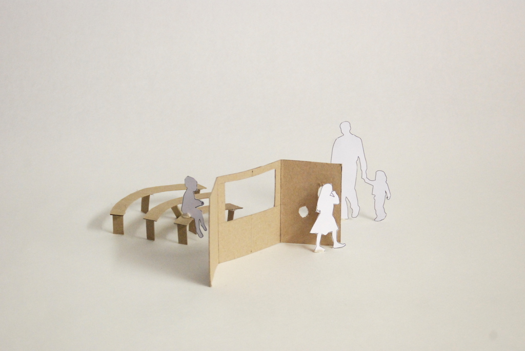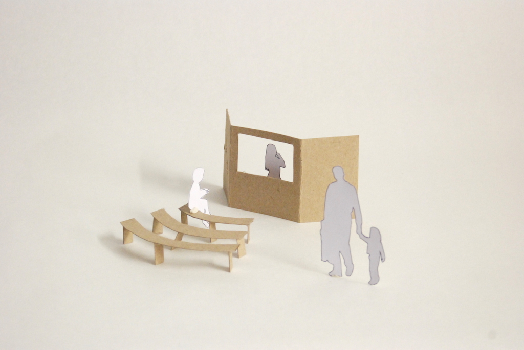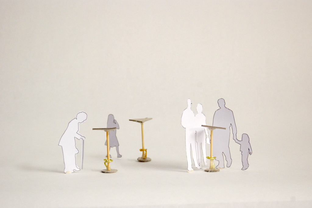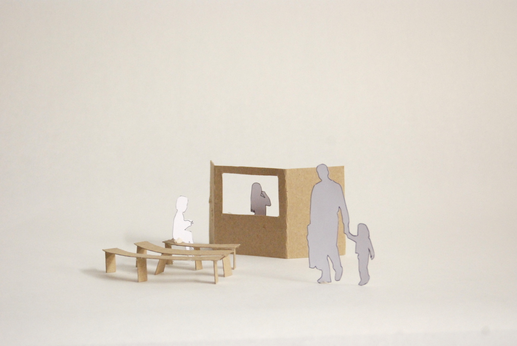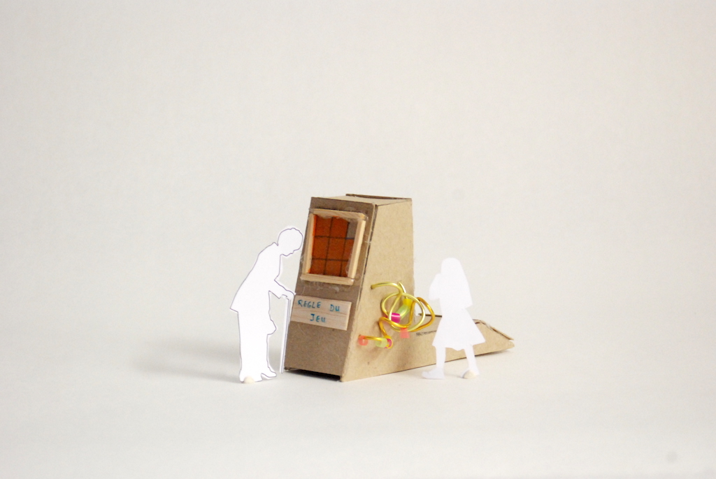 - une borne de jeux pour les enfants et les adultes. D’un côté un puzzle à reconstituer, de l’autre un labyrinthe de perles, une ardoise, un jeu de morpion, etc. > idées centrales : intergénérationnel, ludique, signalétique.