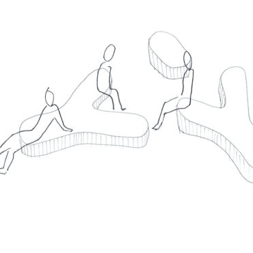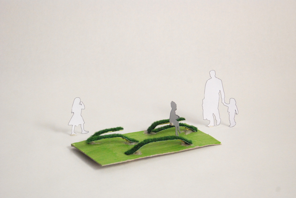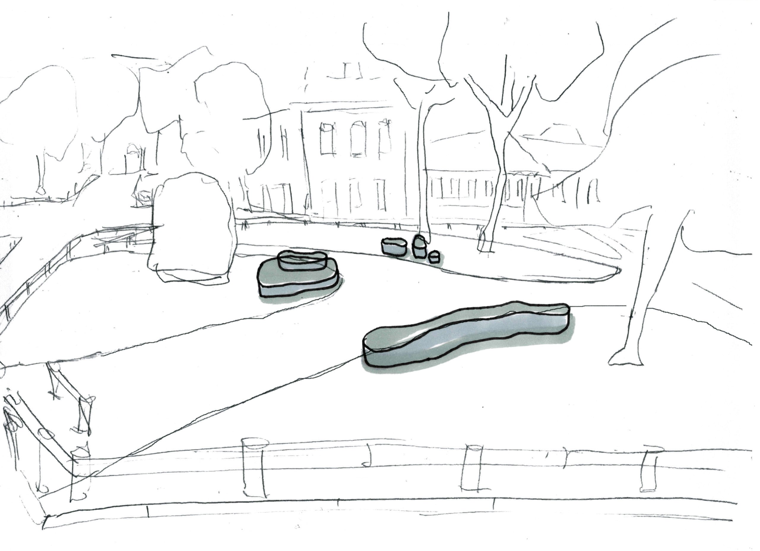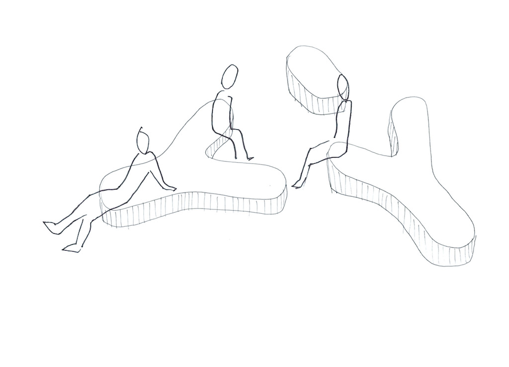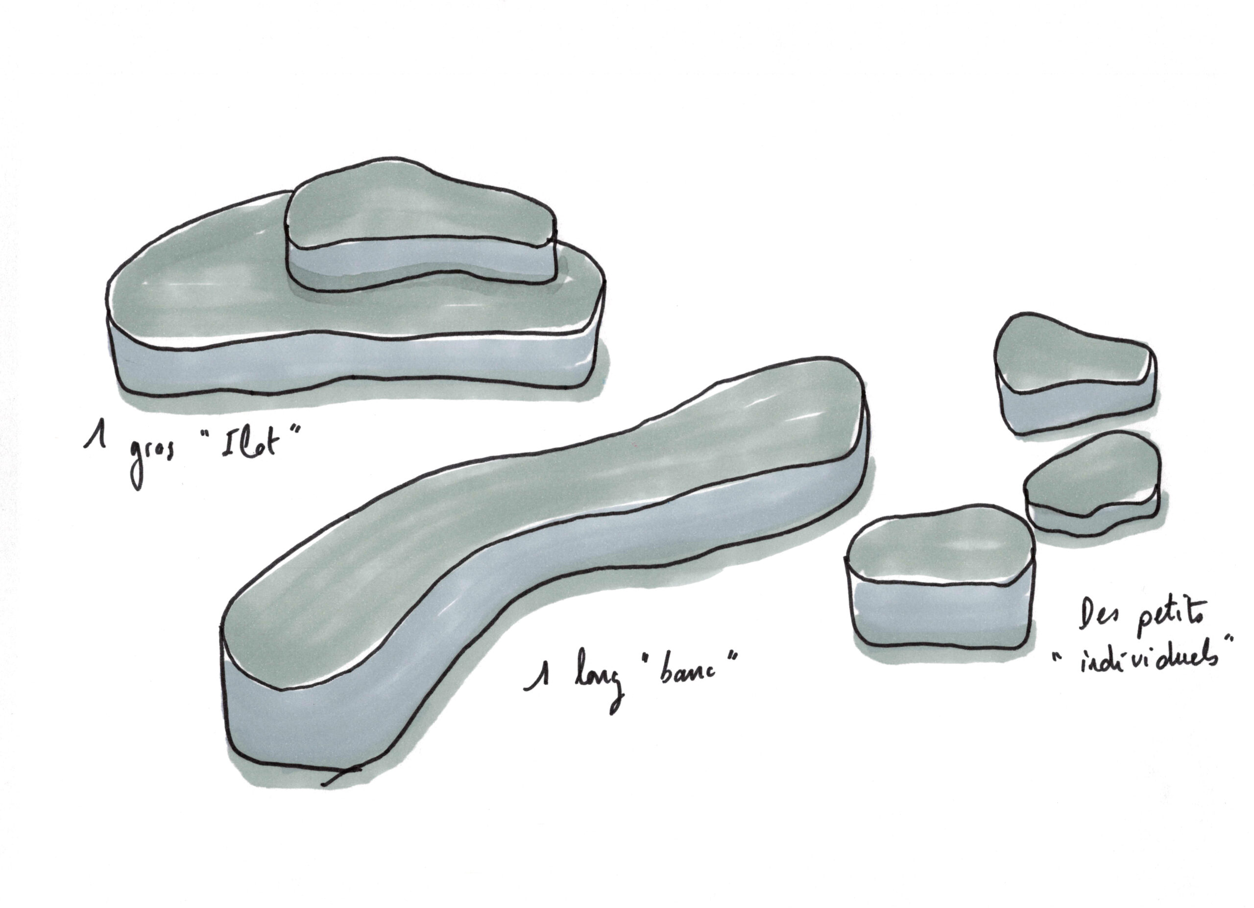 - Des bancs comme sortis du sol, comme si la pelouse se surélevait par endroits. > idées centrales : visuel, convivialité, végétalisation, intégration dans le paysage.