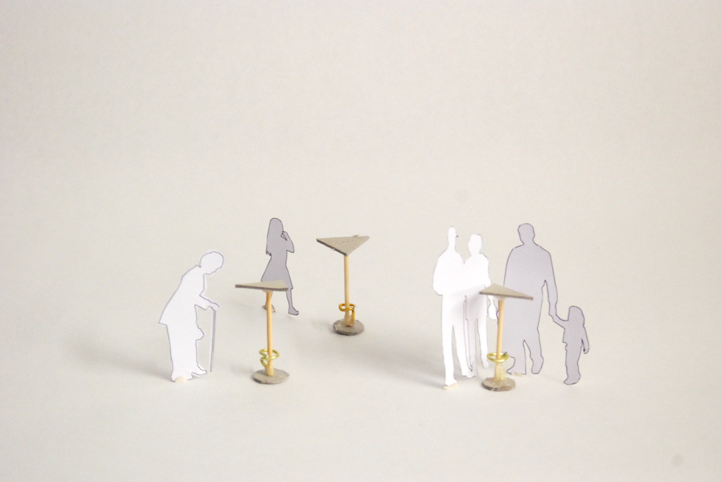 - des « mange-debout » qui ponctueraient l’espace sur la pelouse, pour se réunir en petit groupes. > idées centrales : la réunion, le partage, une liberté d’usage