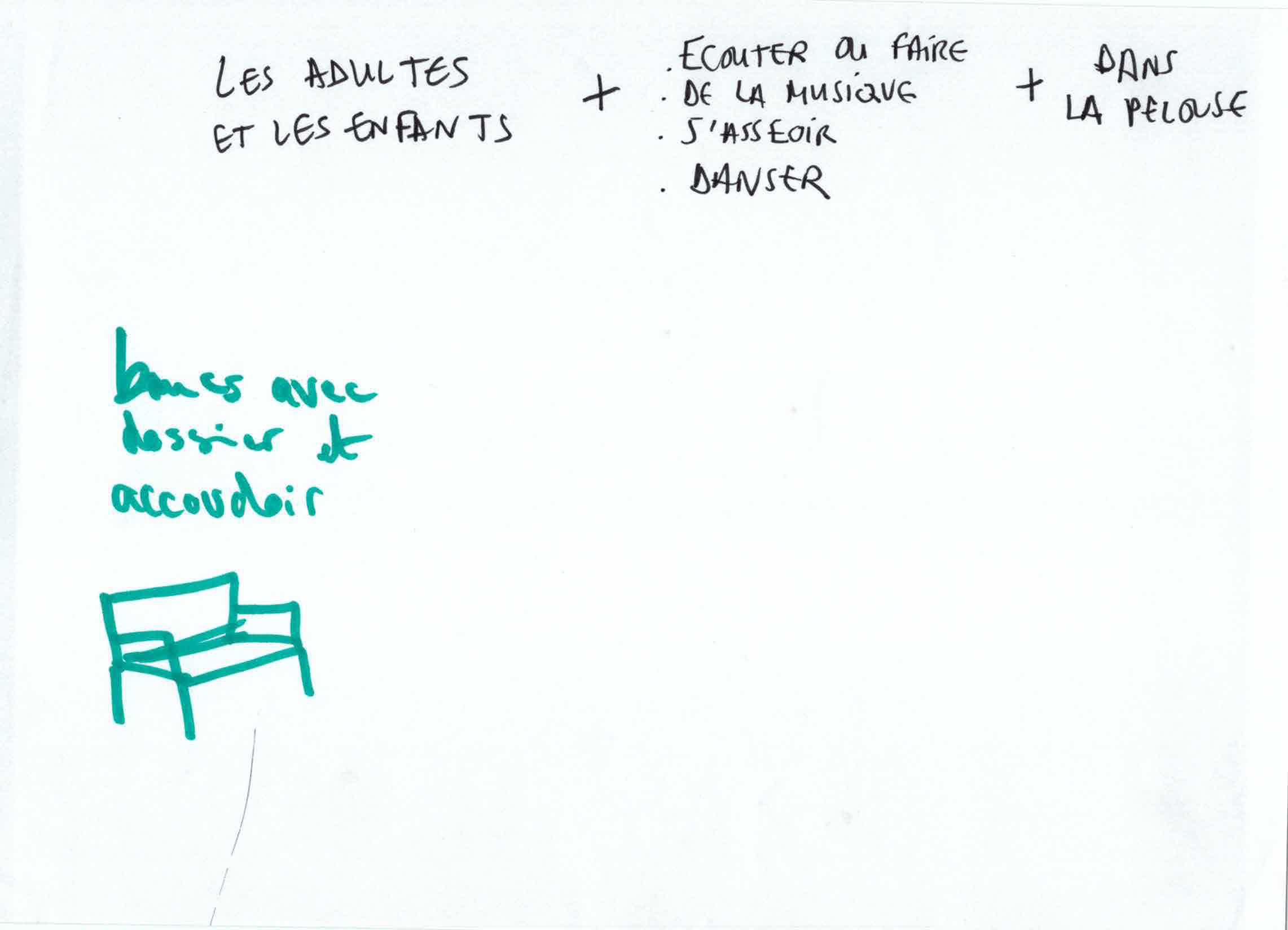 Chacun-e se lance dans la conception et dessine ses idées pour répondre au scénario. Après une heure d’ébullition, nous nous présentons nos solutions. Le caractère ludique revient beaucoup, également la convivialité et les activités sportives. Ainsi, on découvre une terrasse, une banquette géante, des décors, des jeux de motricité pour les petits, les personnes âgées mais aussi les animaux. La semaine prochaine place aux maquettes et aux premières pistes d’implantation !