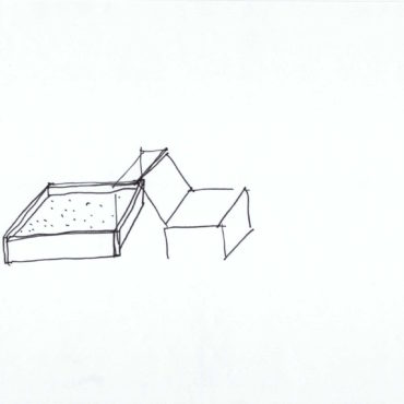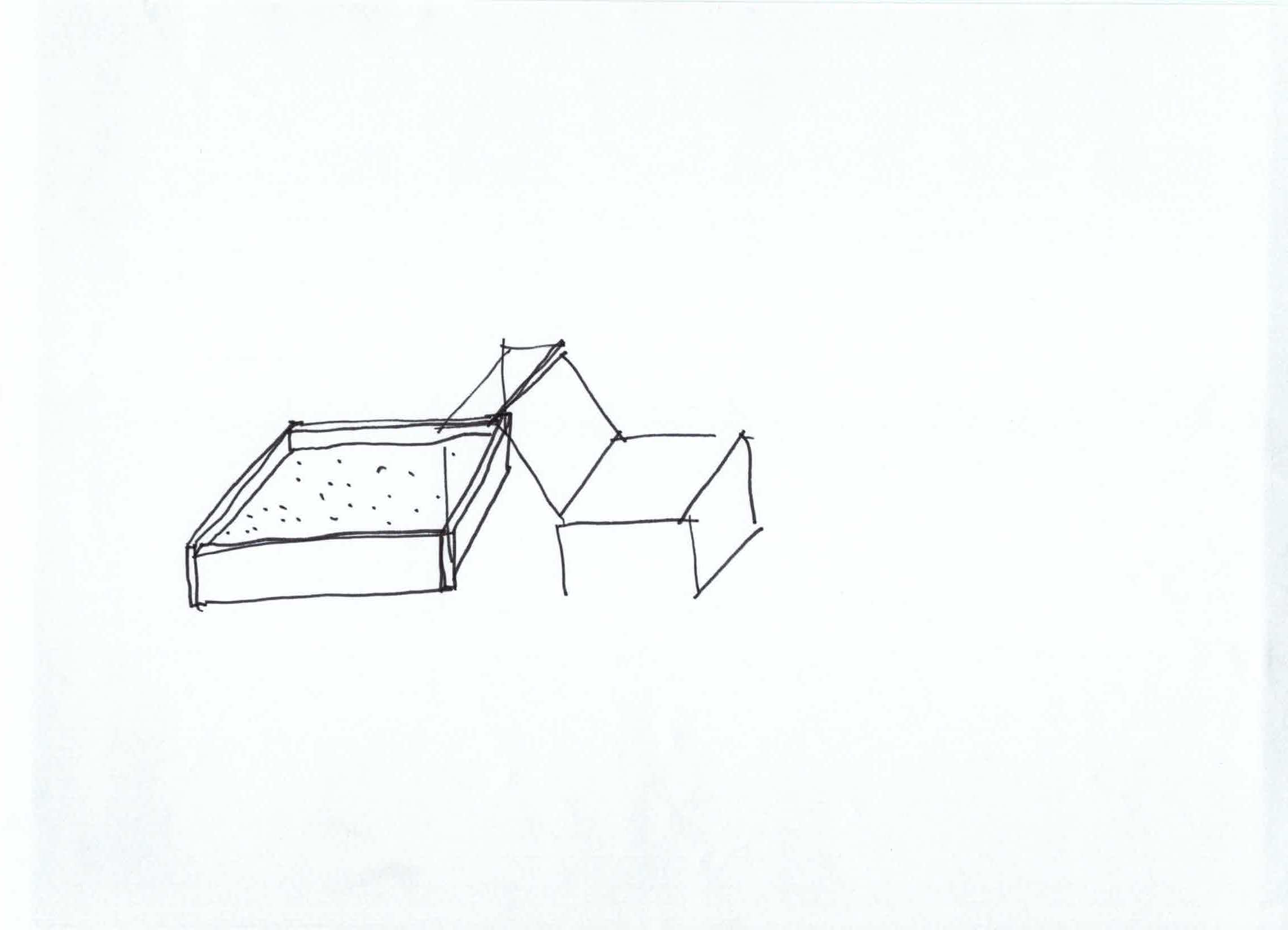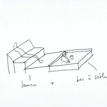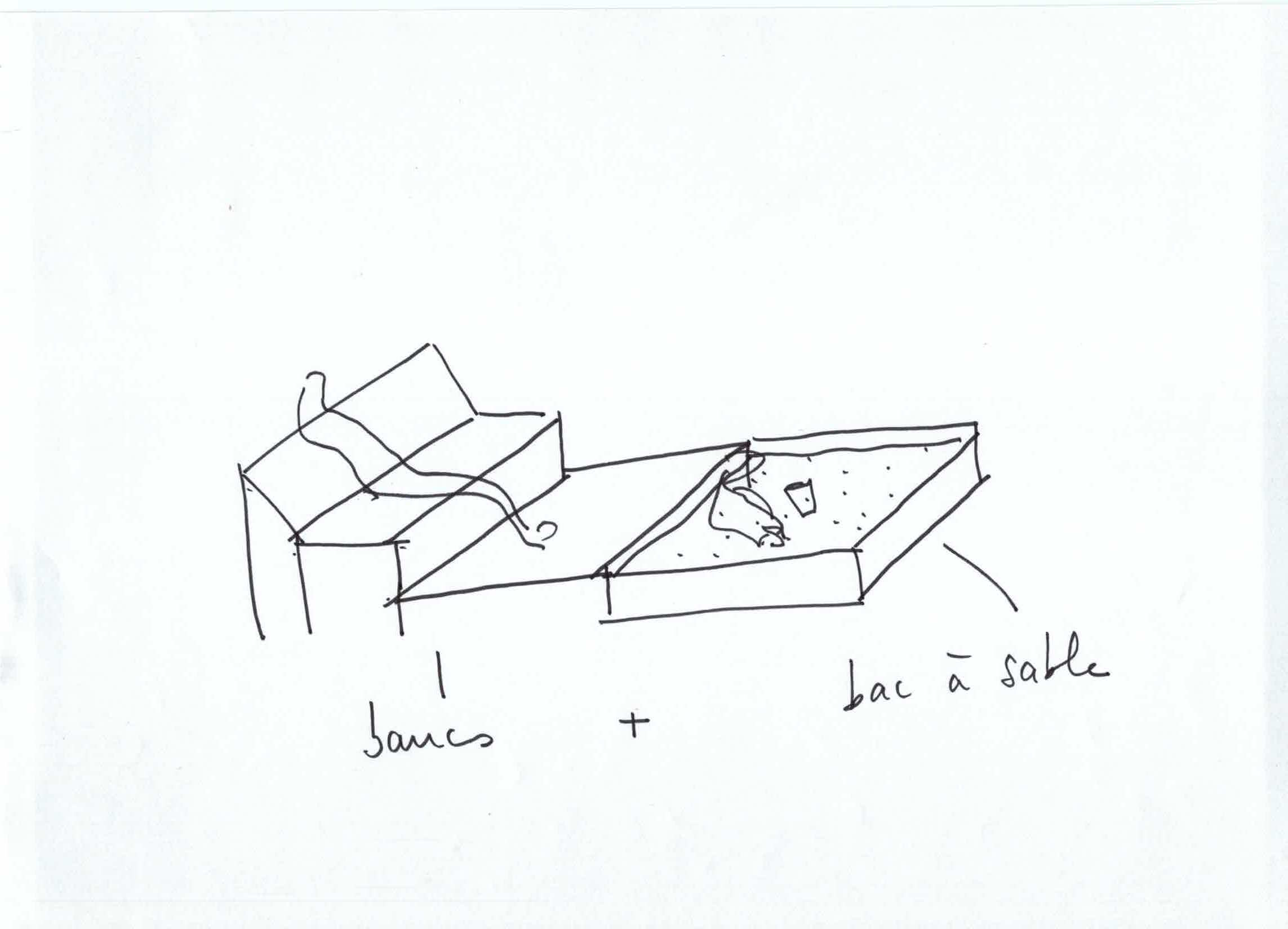 - un bac à sable que l’on referme quand il n’est pas utilisé (pour éviter les déjections canines). Ouvert, les deux pans de couvercle se transforment en bancs. > idées centrales : jeu pour enfant, assises, intergénérationnel.