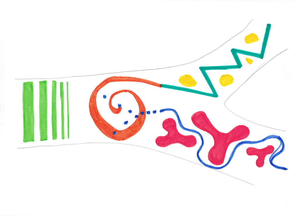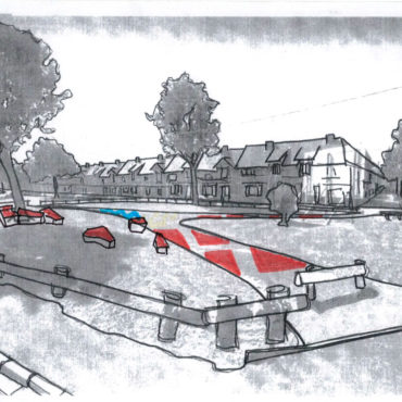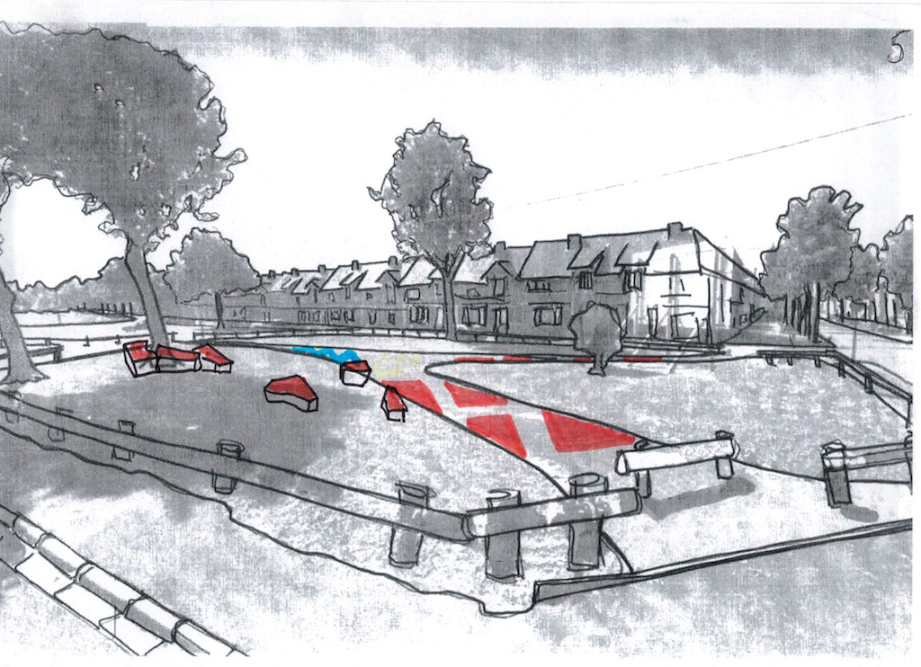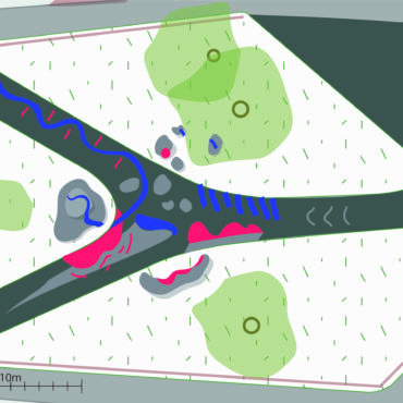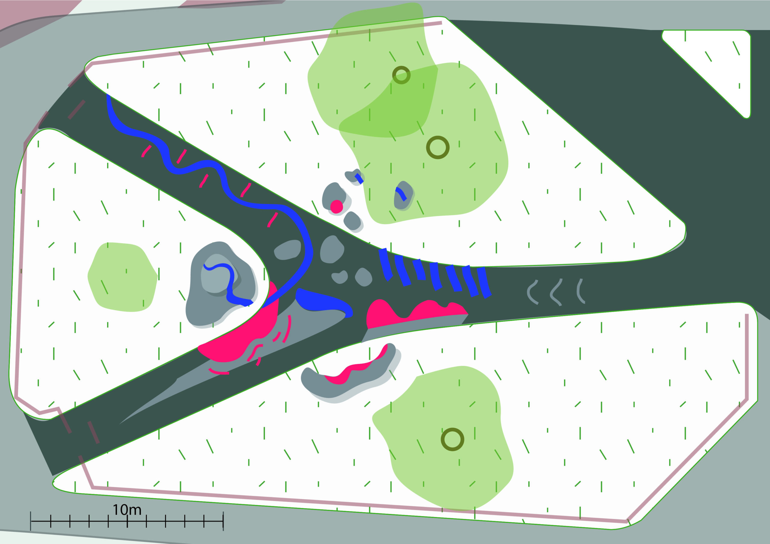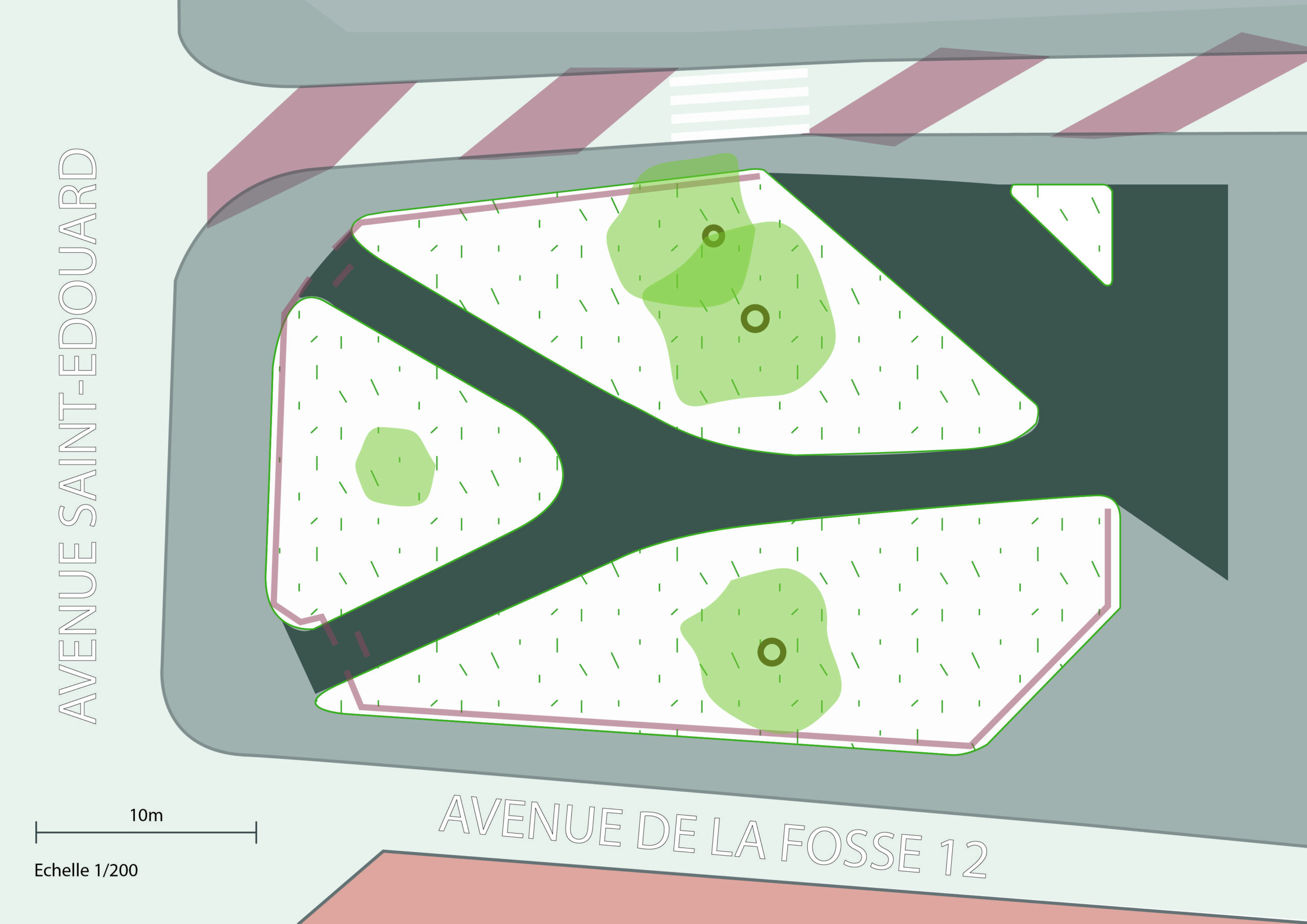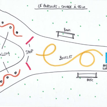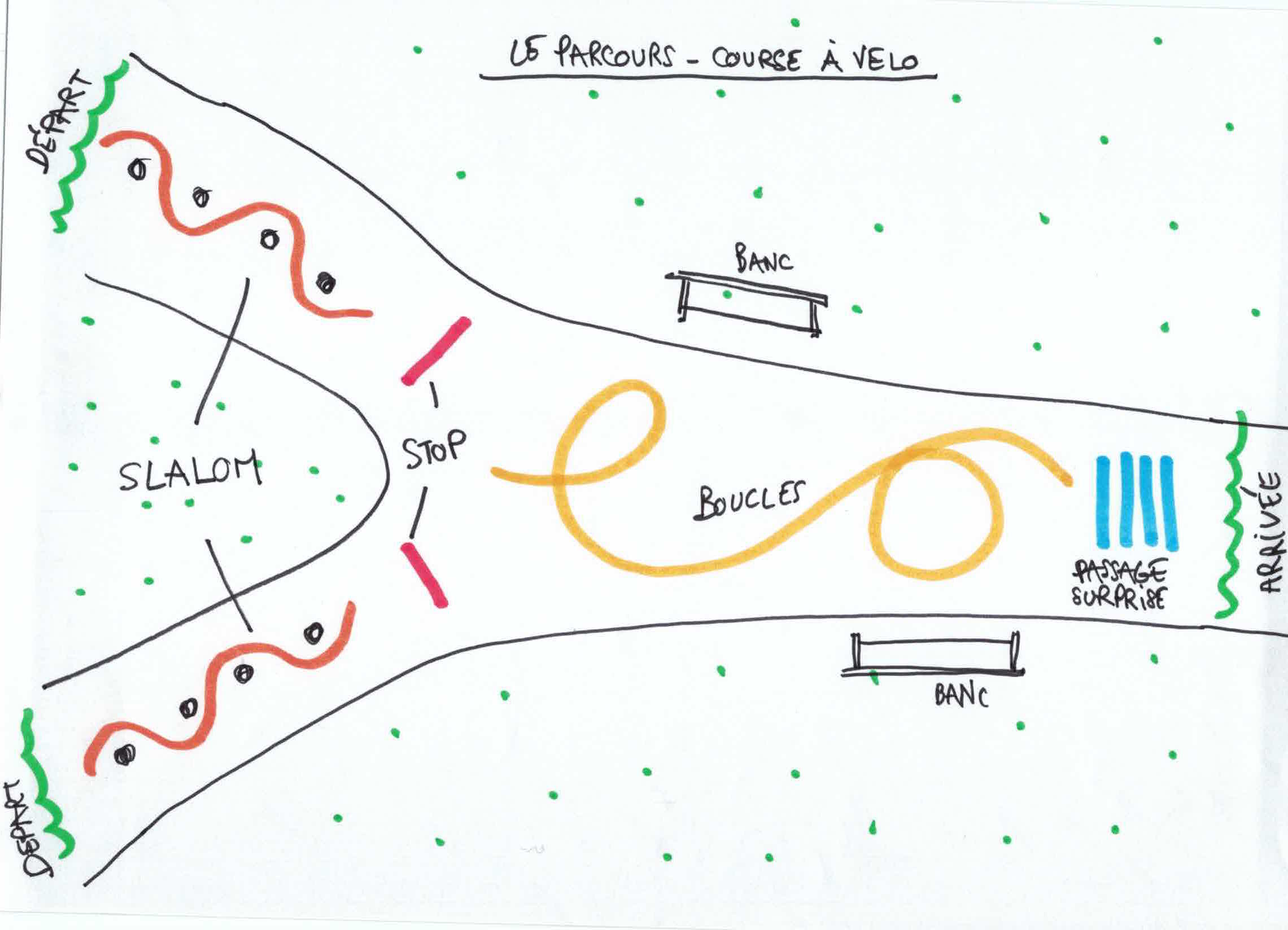 - un parcours pour vélo/trottinette/course/etc tracé au sol pour faire la course. Démarrant des deux branches du « Y », les deux tracés se rejoignent en son milieu. > idées centrales : visuel, ludique, parcours, liberté d’usages