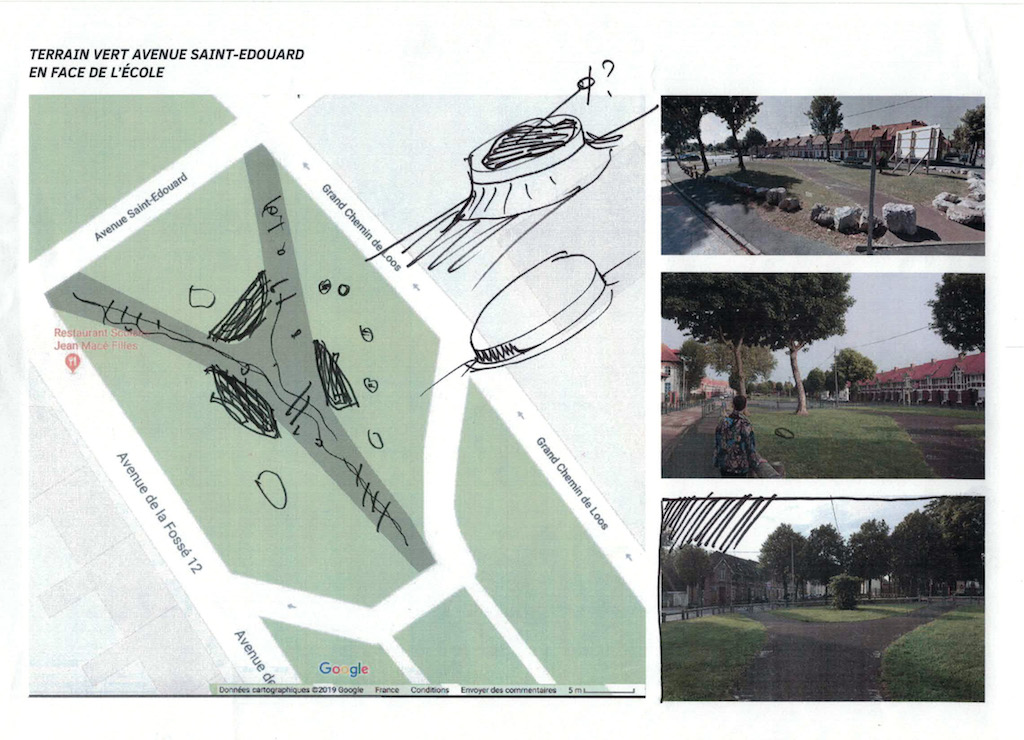 Après analyse des différents lieux, et discussion autour des choses déjà présentes, on choisit le terrain vert devant l’École Primaire Georges Lapierre ! Nous sommes tous d’accord sur l’intérêt de créer un lien avec l’école, notamment avec les parents qui déposent ou attendent leurs enfants. Ce lieu est propice à des échanges intergénérationnels et à être activées par différents acteurs : les habitants, les associations locales, l’équipe enseignante, les élèves de l’école, etc.