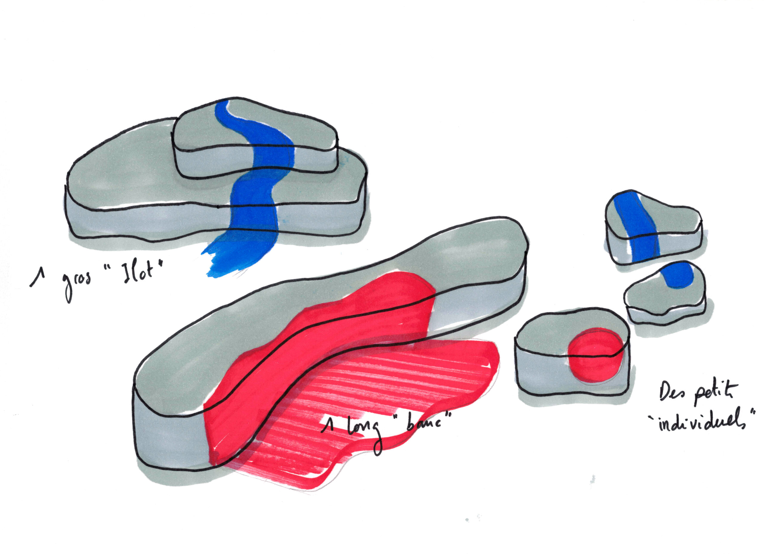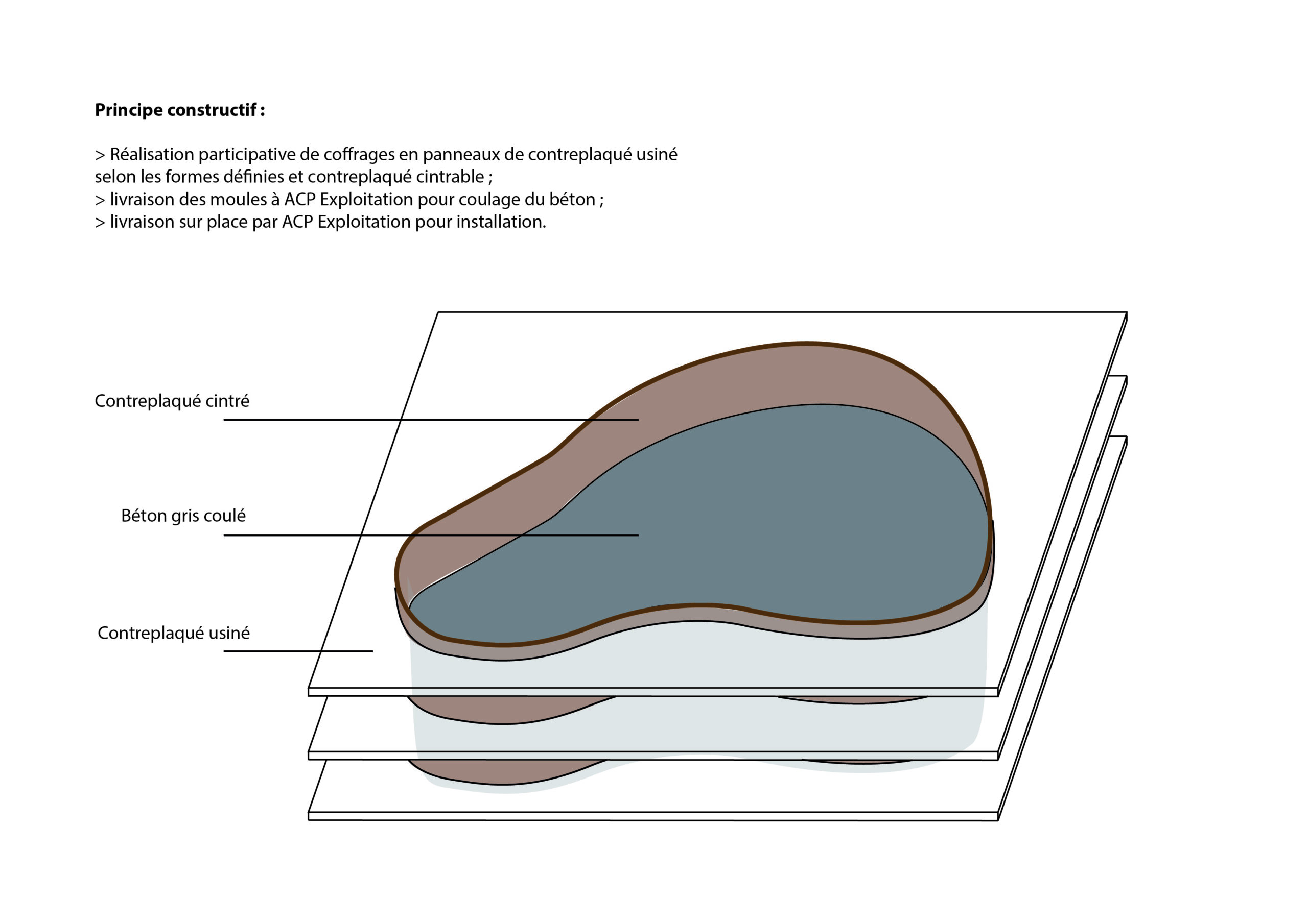 Après avoir reprécisé et réaxé le projet sur les usages principaux du jeu et de la pause, nous déterminons ses aspects formels. Côté technique, nous partirons sur du marquage au sol pour le ludique et pour égayer la place, ainsi que sur des volumes de bétons qui assureront les fonctions d’assises mais qui pourront aussi être interprétées, détournés librement.