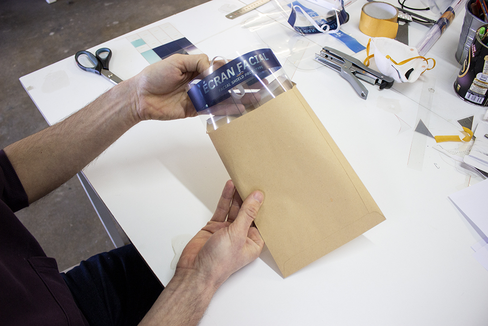 À destination des professionnels de santé et plus largement des professionnels en contact répété avec le public, cet écran facial est composé de matériaux accessibles et se fabrique en 3 minutes.