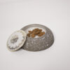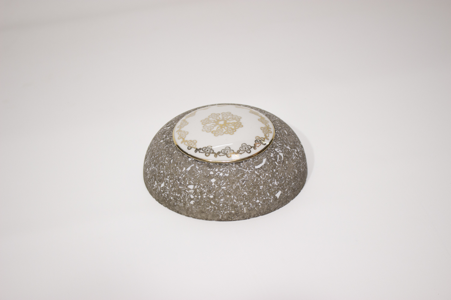 Une fois extrait de son moule, chaque objet est poli et laisse apparaître des fragments et éclats de faïence présents dans sa masse.
