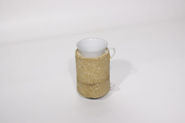 Une fois extrait de son moule, chaque objet est poli et laisse apparaître des fragments et éclats de faïence présents dans sa masse.