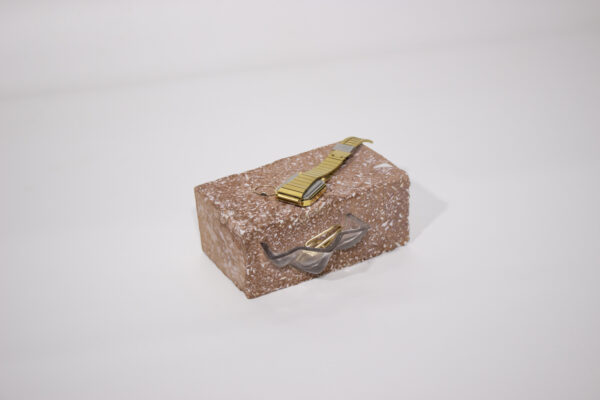 Une fois extrait de son moule, chaque objet est poli et laisse apparaître des fragments et éclats de faïence présents dans sa masse.