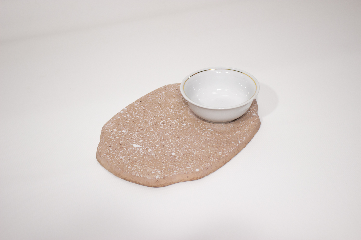 Une fois extrait de son moule, chaque objet est poli et laisse apparaître des fragments et éclats de faïence présents dans sa masse.