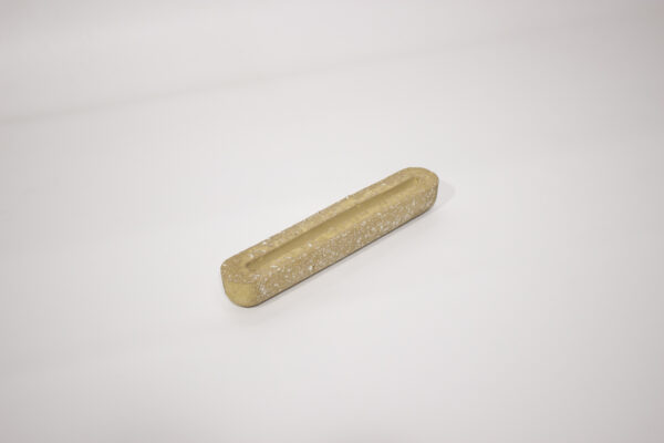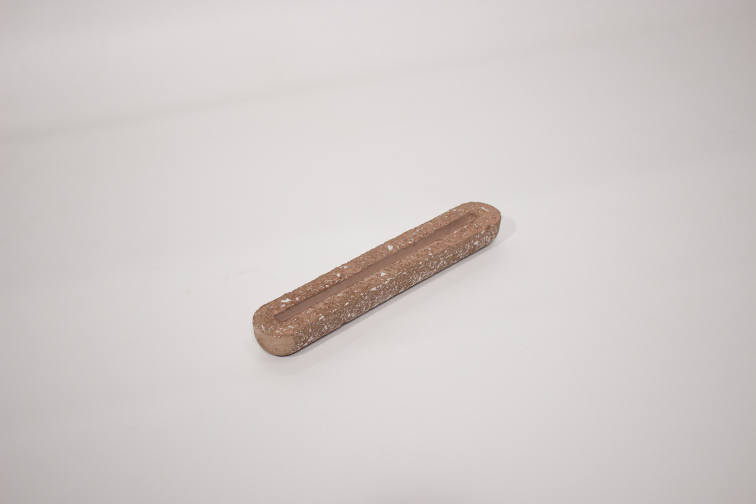 Une fois extrait de son moule, chaque objet est poli et laisse apparaître des fragments et éclats de faïence présents dans sa masse.