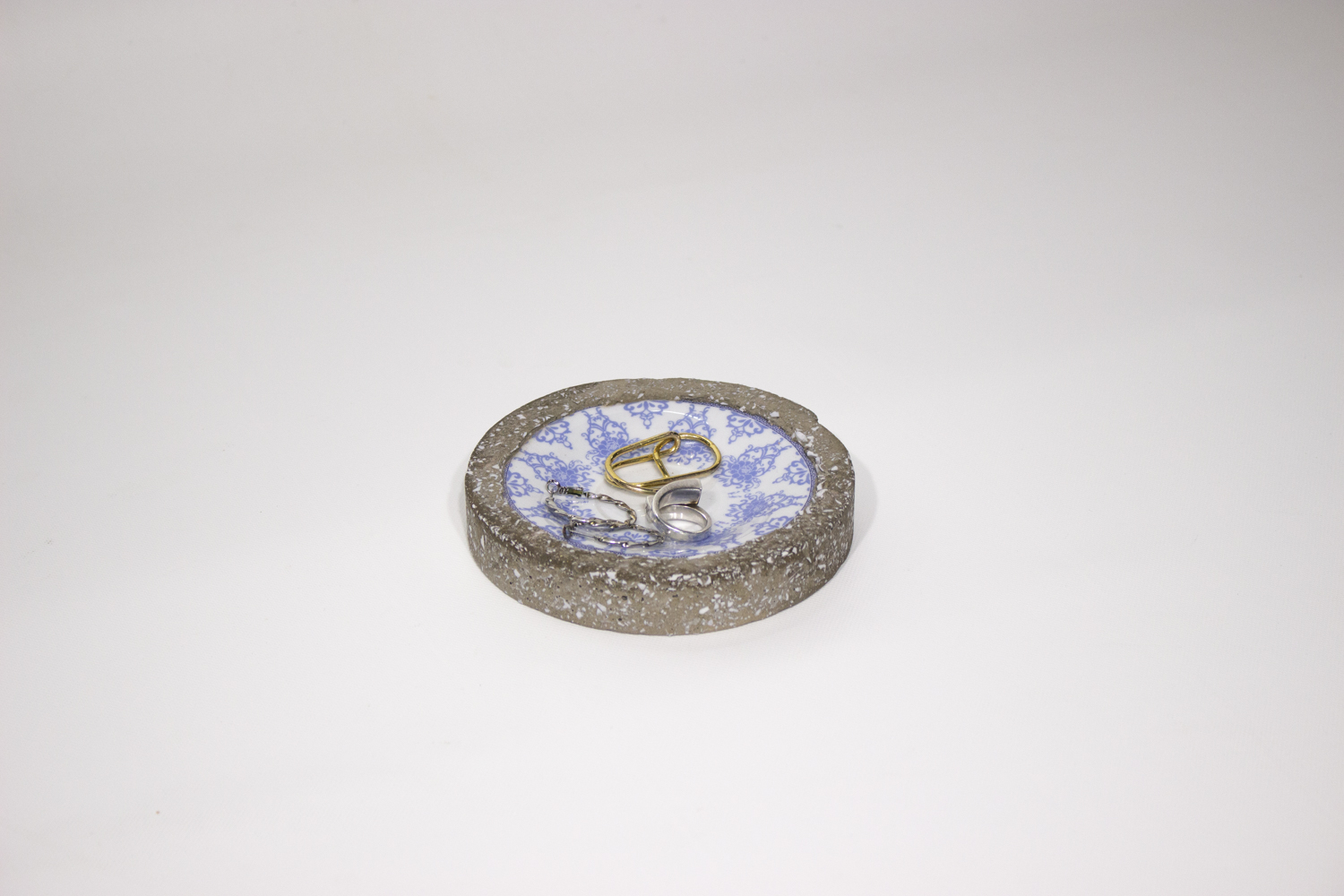 Une fois extrait de son moule, chaque objet est poli et laisse apparaître des fragments et éclats de faïence présents dans sa masse.