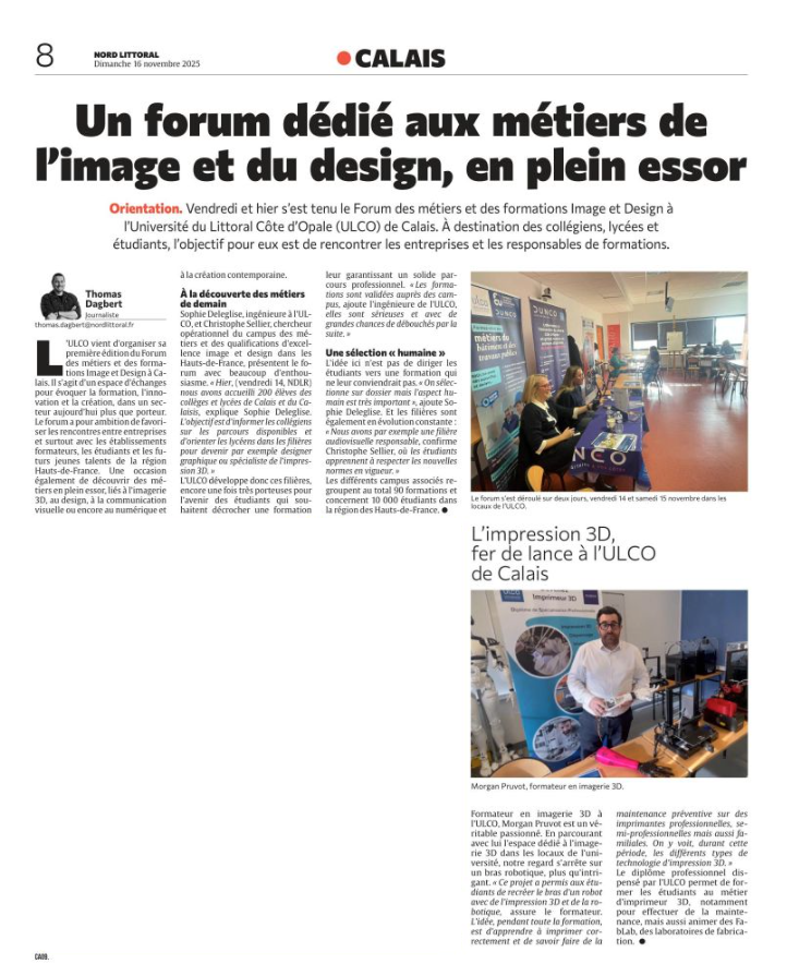 Organisé par l’ULCO site de Calais et le Campus des Métiers et des Qualifications d’Excellence Image et Design Hauts-de-France, les 14 et 15 novembre prochains à l’Université du Littoral Côte d’Opale site de Calais.