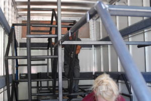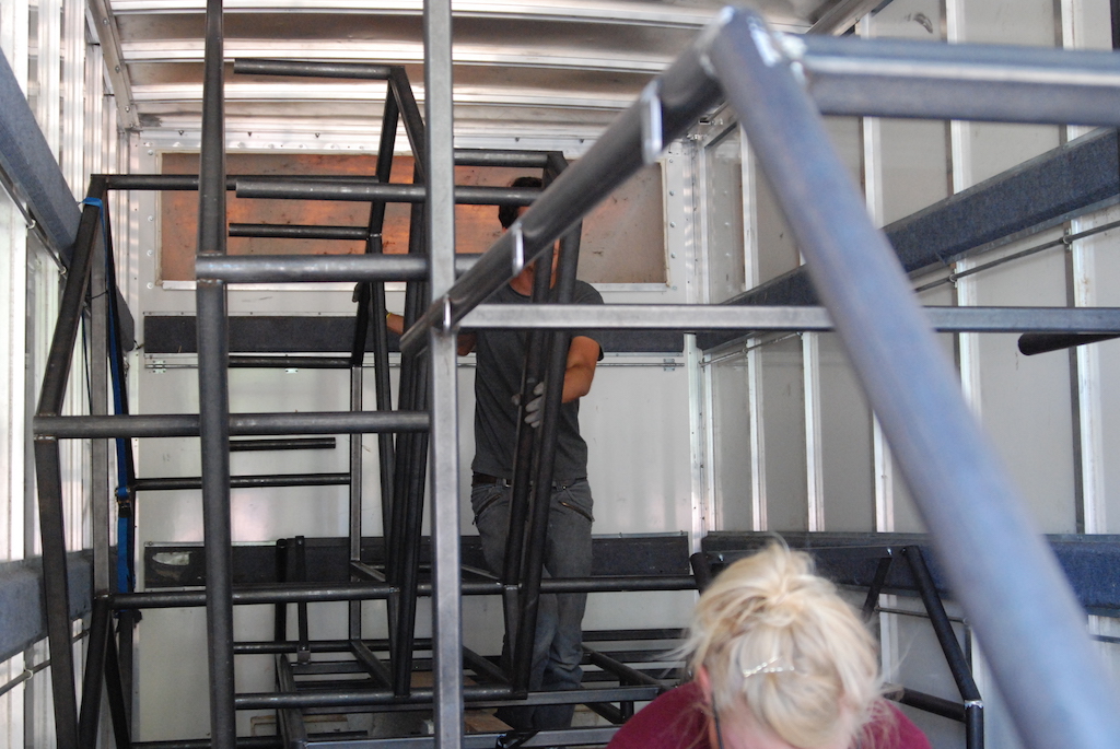 Le chantier a pris place au cœur de l'Unité, dans la cour. Au fil des jours, plusieurs postes et missions s'y sont succédé (découpe, ponçage, vitrification, assemblage, désossage et stockage des anciens meubles, documentation).