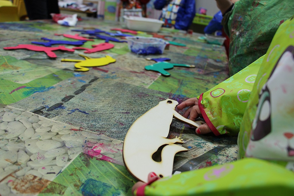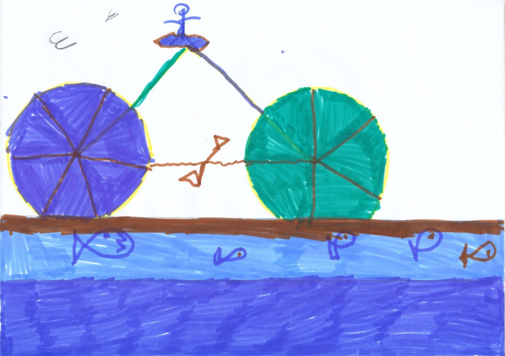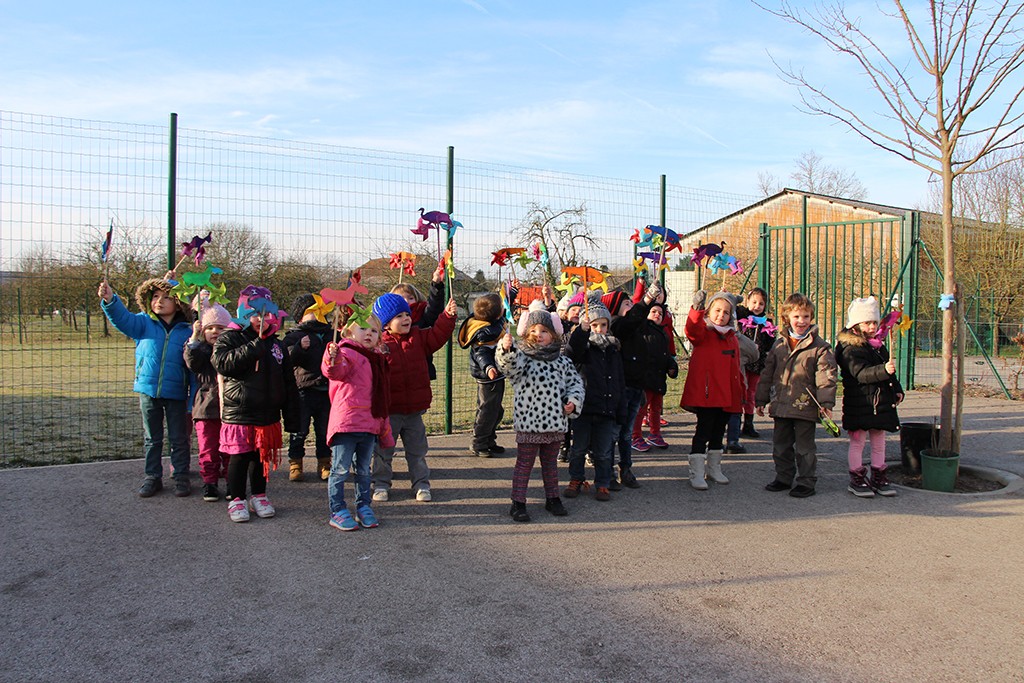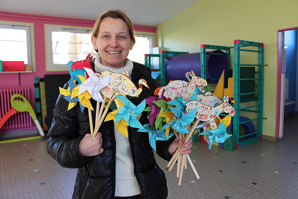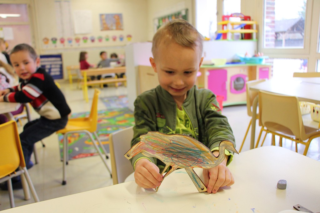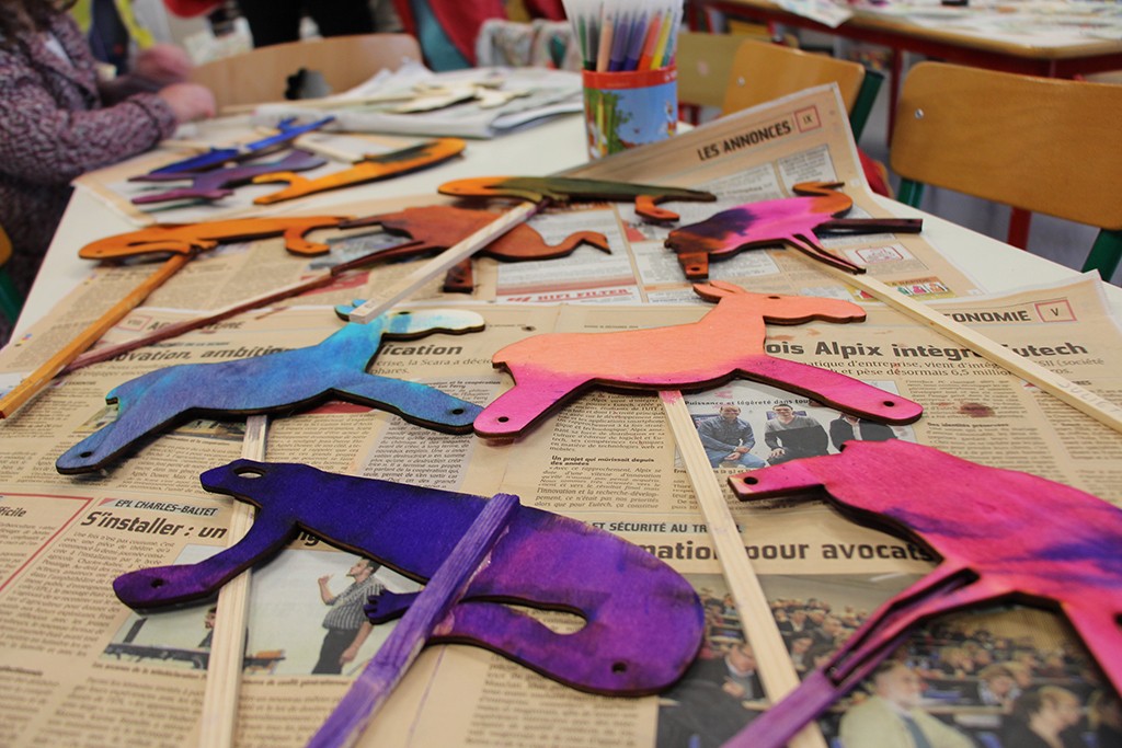 Les élèves de maternelles ont réalisés des « animaux-vélo » : il s’agit de moulins à vent, deux éoliennes montées sur des profils d’animaux en bois. Nous parlons ainsi avec eux de trois espèces remarquables et représentatives de la faune du parc : l’élan, la salamandre et la grue. Nous abordons également le mouvement circulaire à travers la roue de vélo, et l’énergie du vent. Durant les ateliers, les enfants ont décoré leur animal et leurs roues et ont créé de grandes fresques collectives représentant une rondes des animaux. Ils ont pu éprouver leur création lors d’une grande sortie collective dans la cours de chaque école pour faire rouler – ou voler – leurs « animaux-vélo ».