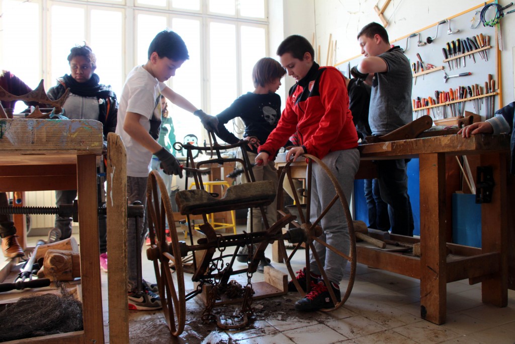 Nous proposons aux élèves d’inventer une machine « artistique », « poétique », utile ou loufoque pour le parc, ses habitants, visiteurs ou animaux. Une seule contrainte, ces machines doivent être mises en mouvement par le biais d’une énergie renouvelable : vent, soleil, eau, geste humain ou animal, etc. Les mécanismes animant ces sculptures pourraient être empruntés à ceux des anciennes machines agricoles et artisanales de l’écomusée.