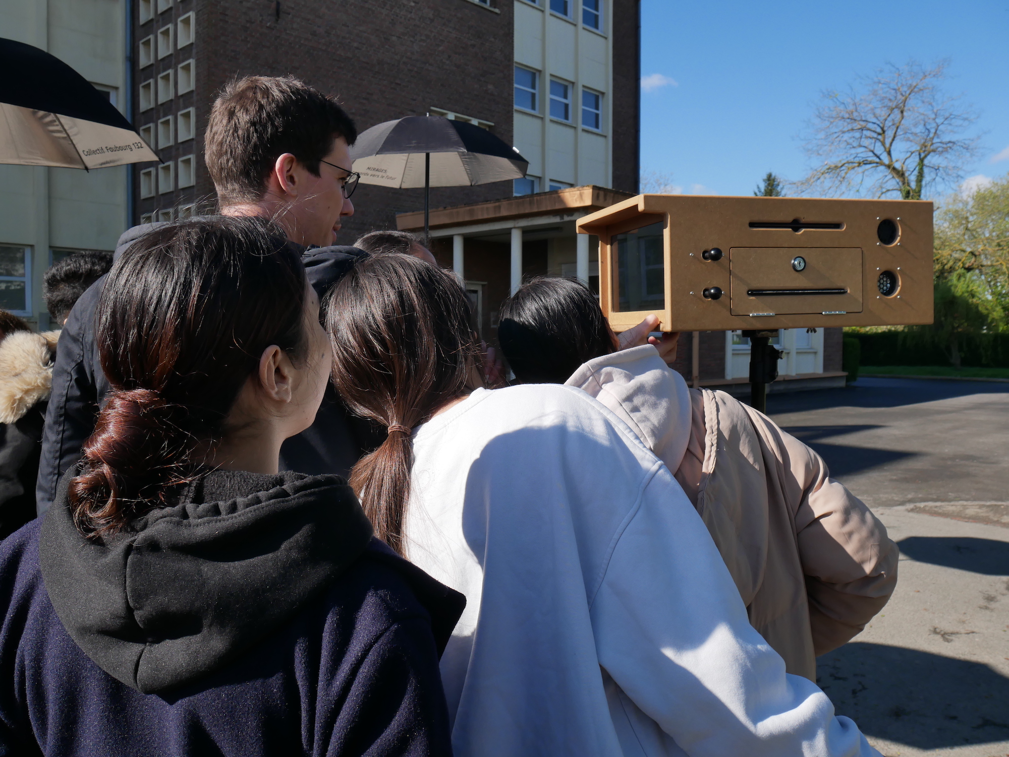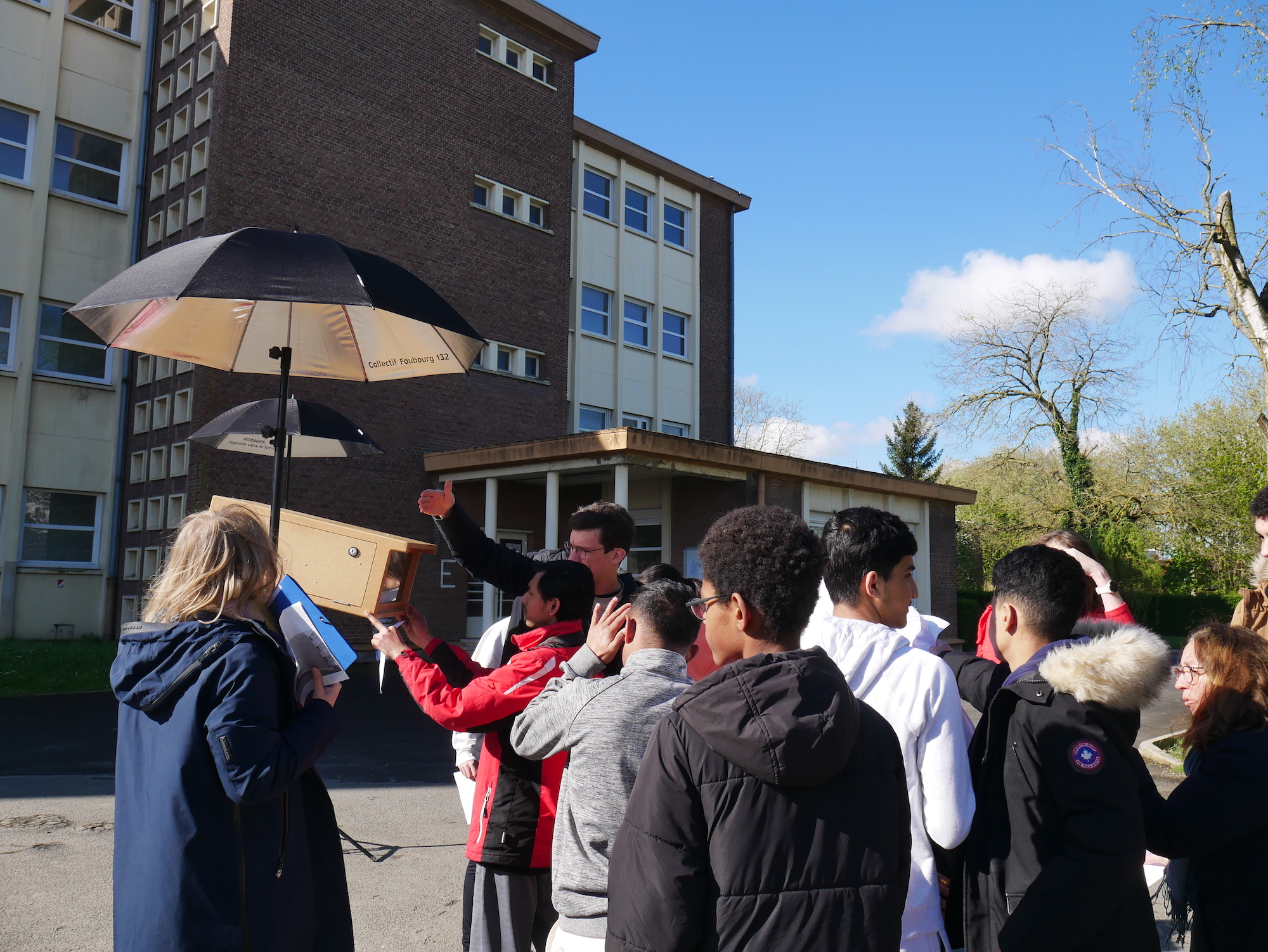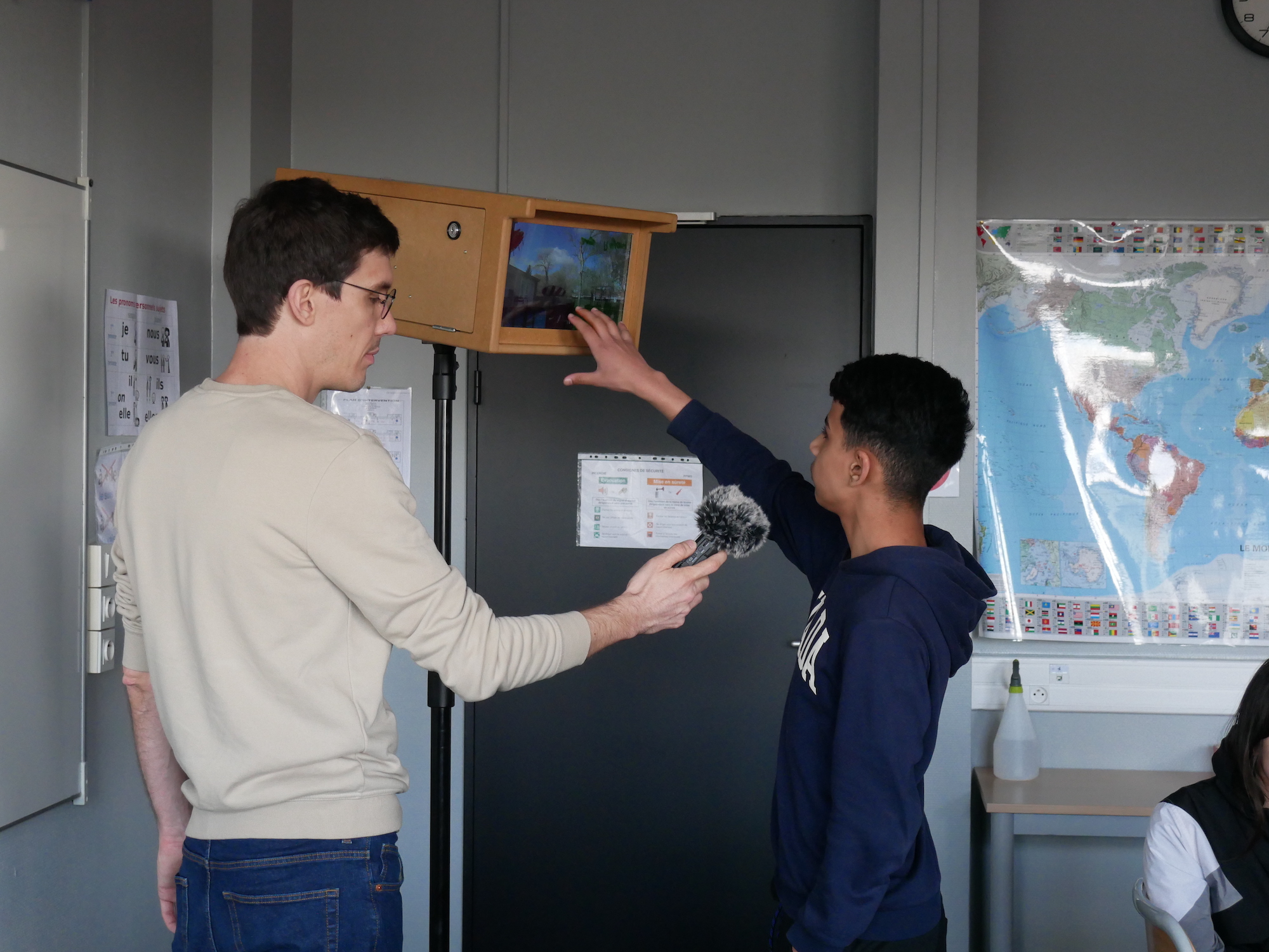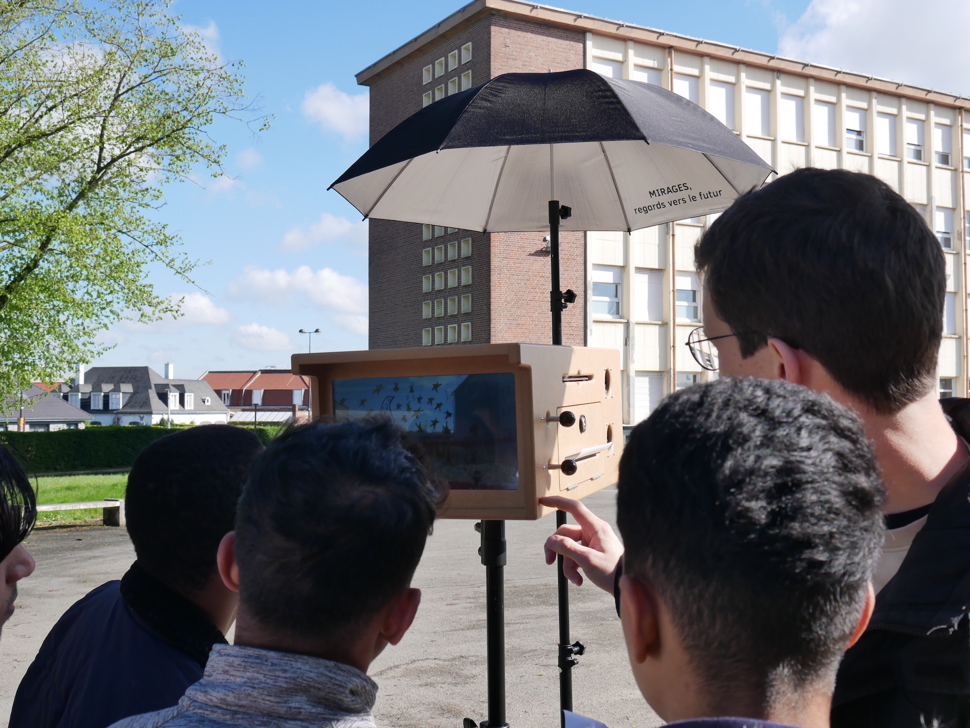 Observation collective grâce à notre Machine à voir le futur et présentation aux élèves e enseignant·e·s du Lycée dans le cadre d’un temps fort de restitution.