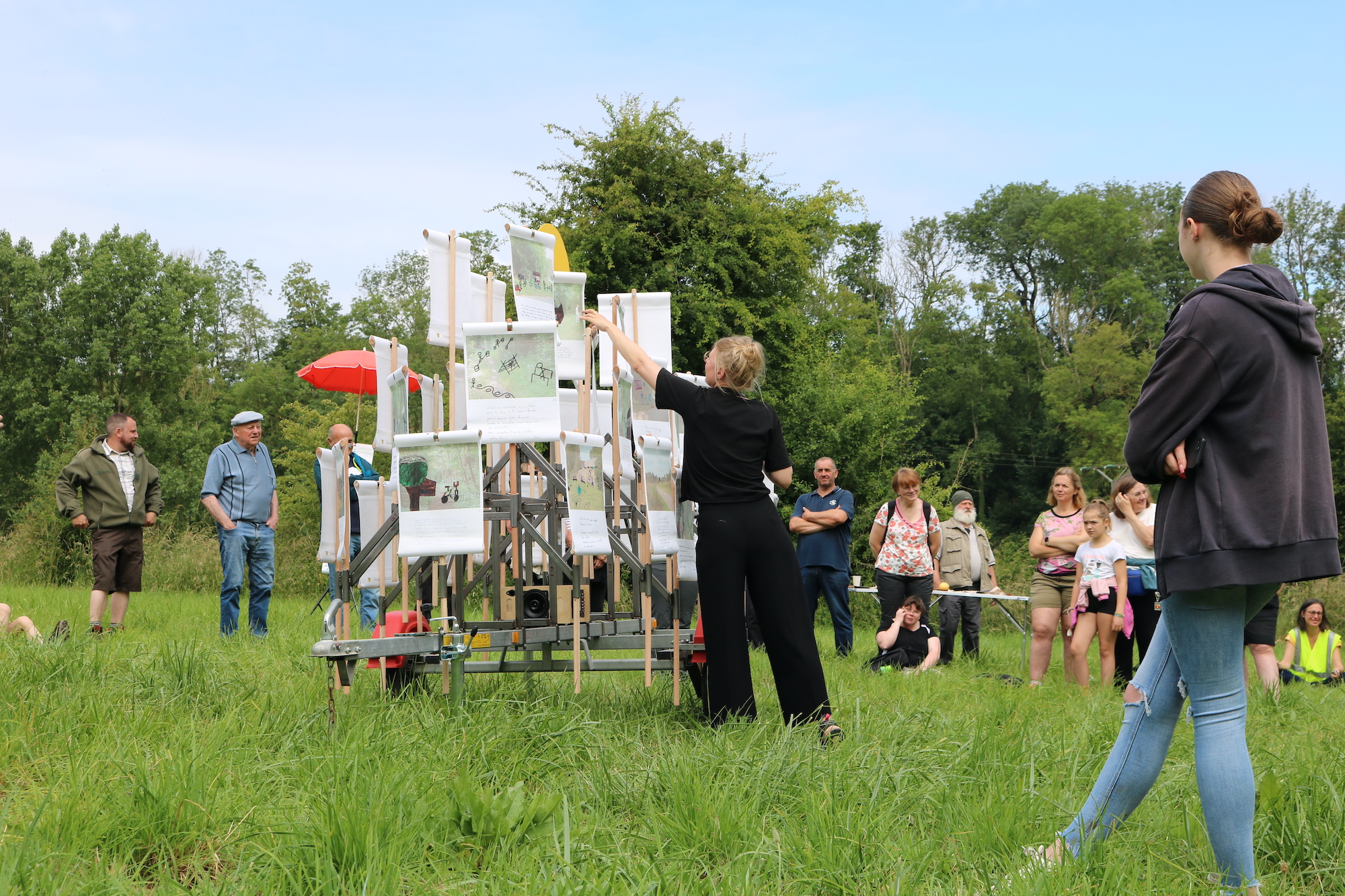 Ces images de futurs rêvés ont été présentées publiquement lors d’un cortège festif le long de la Transternésienne en juin 2024. Elles ont ainsi circulé au fil de quatre randonnées reliant Auxi-le-Château, Beauvoir-Wavans, Noeux-lès-Auxi, Fortel-en-Artois, Frévent et Séricourt.