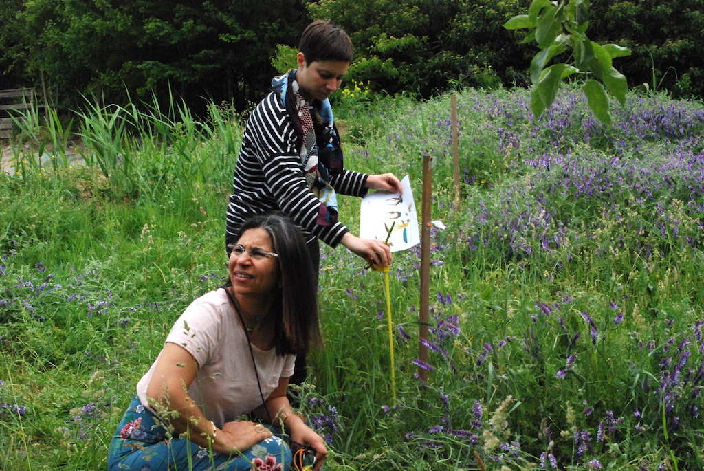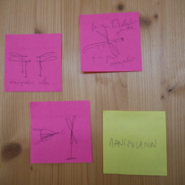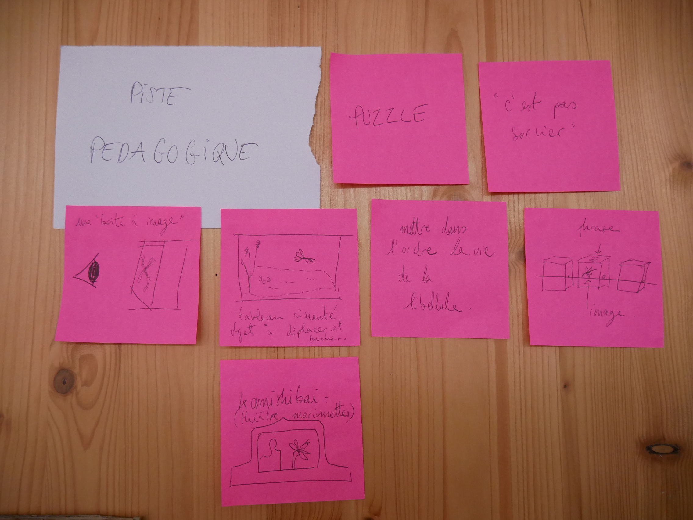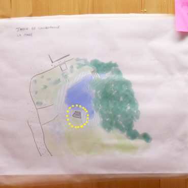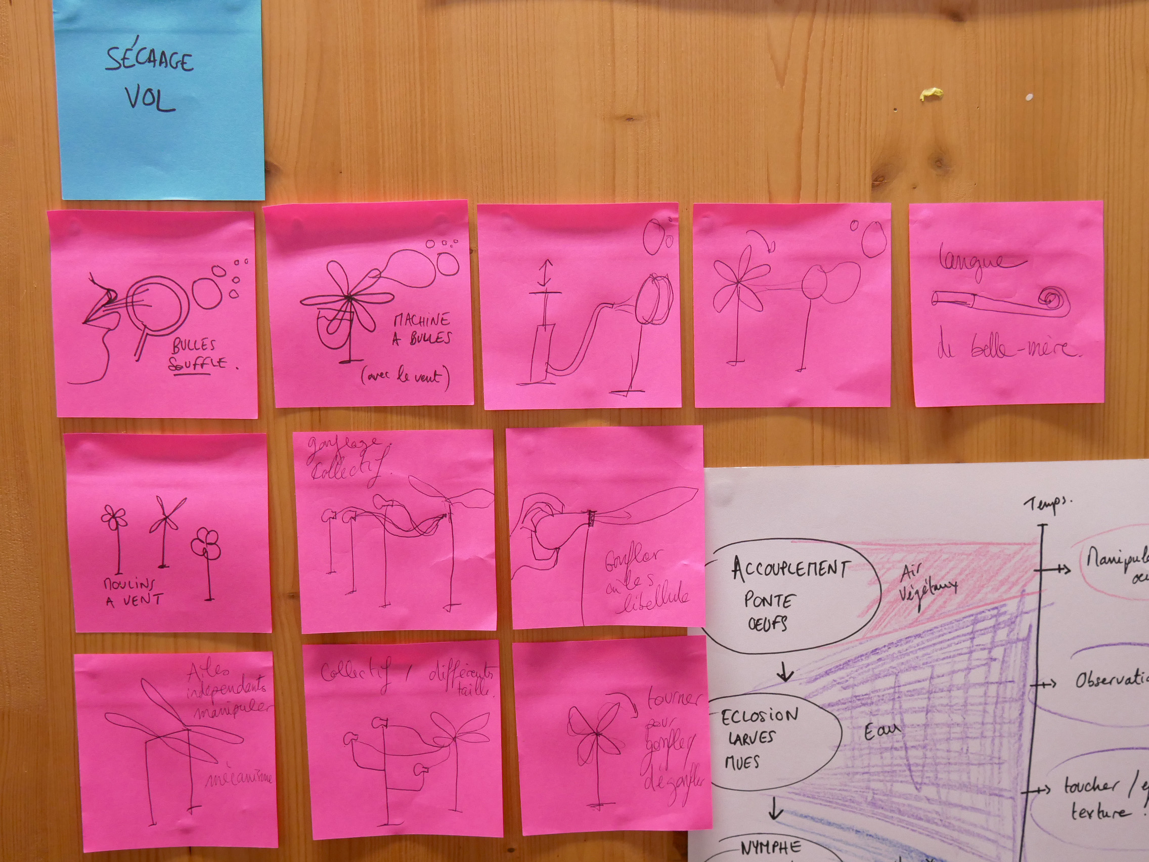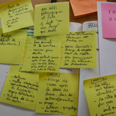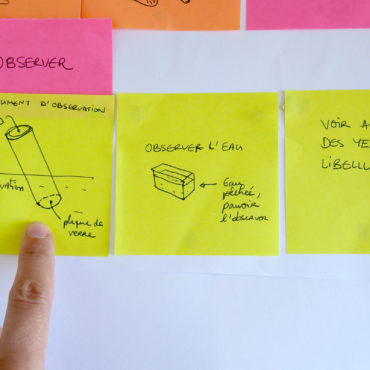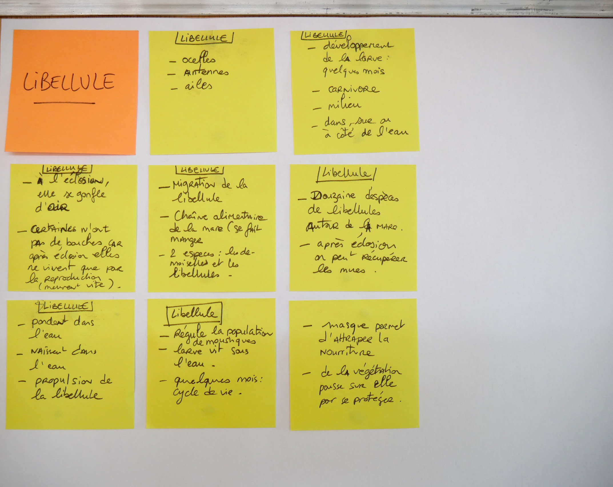 Nicolas du jardin nous donne beaucoup d’informations complémentaires sur les abeilles (voir photo post-it). Il nous renvoie également vers une nouvelle piste : la libellule, qui relie à la mare, point central du projet.