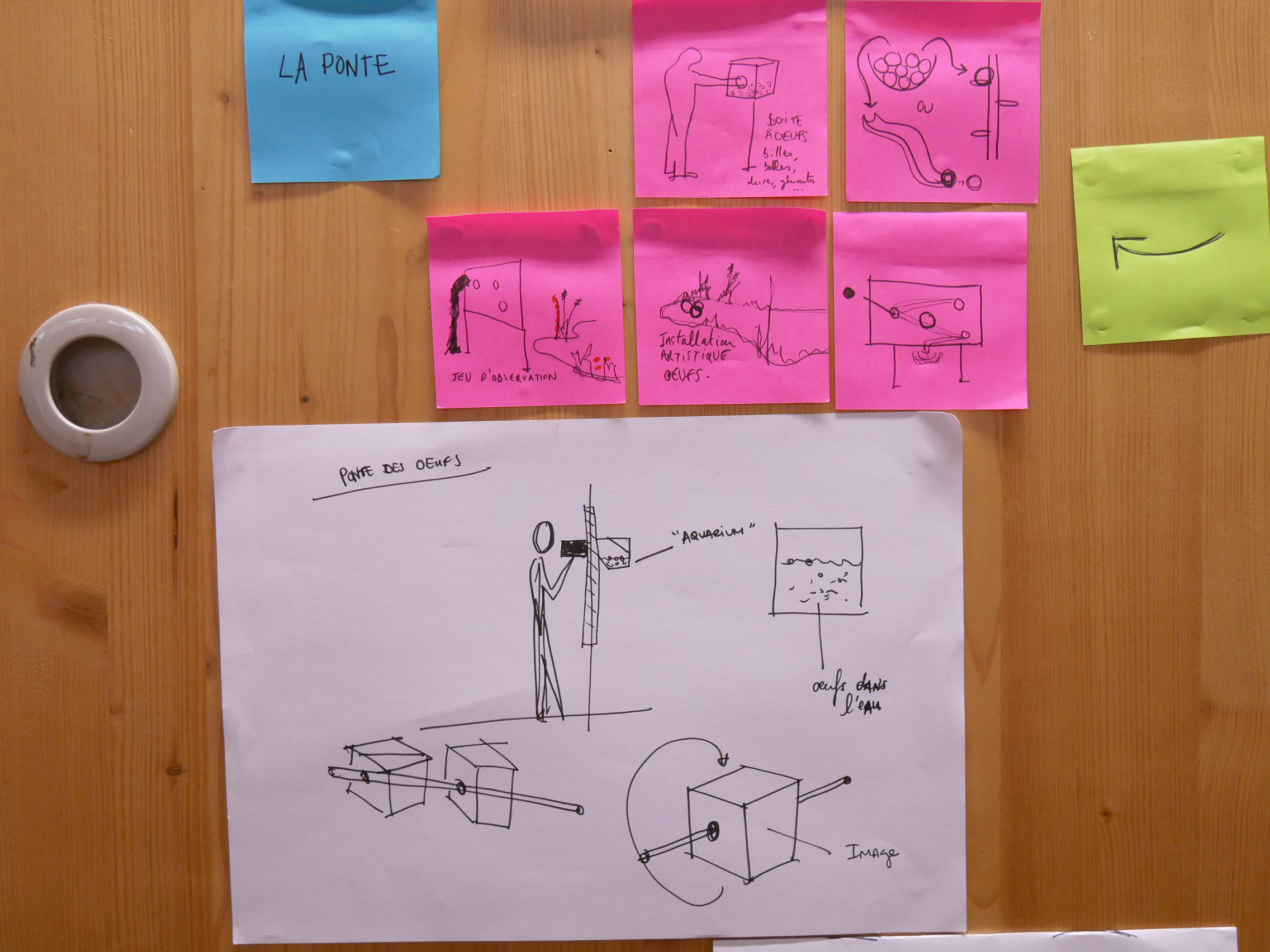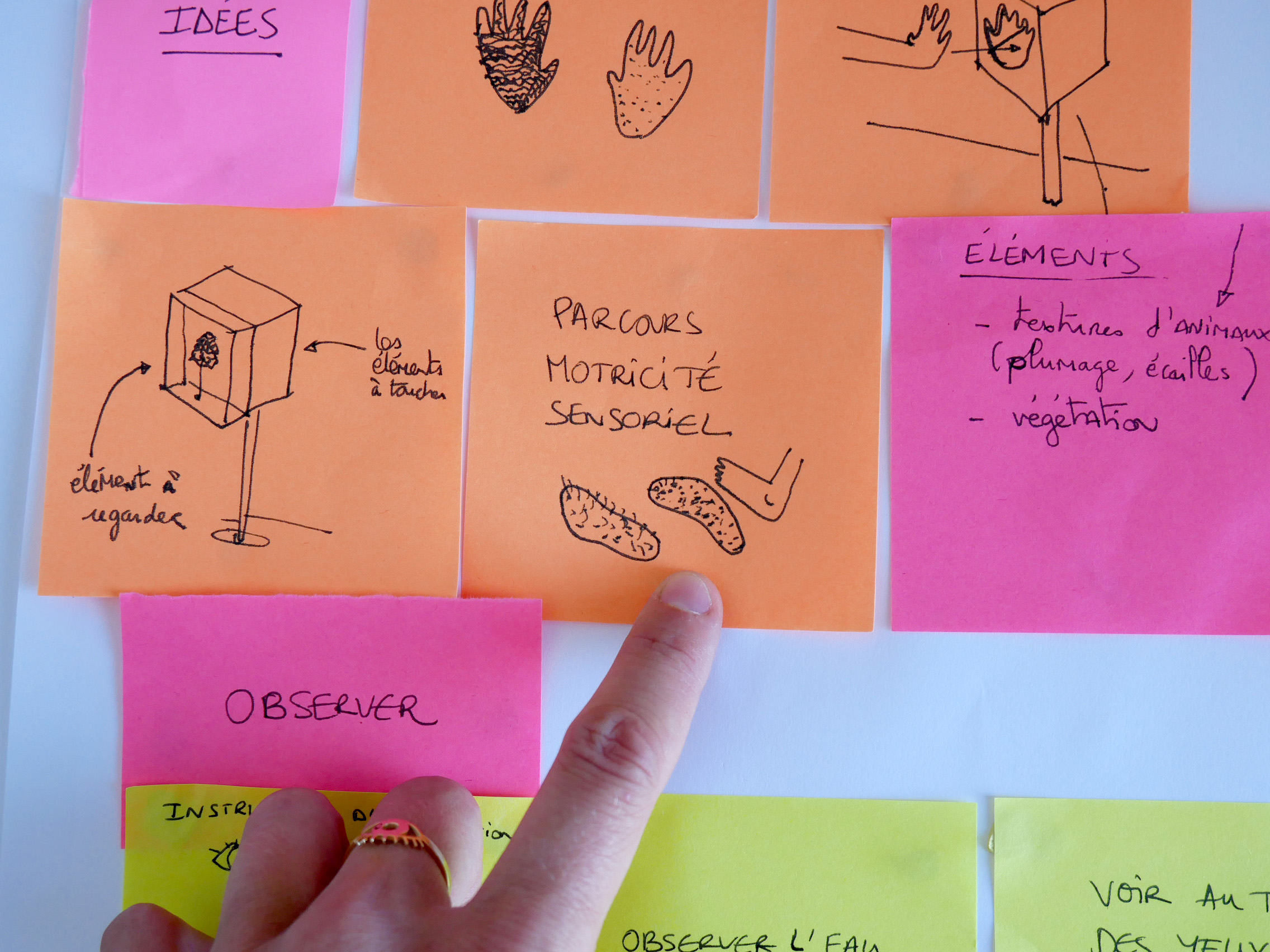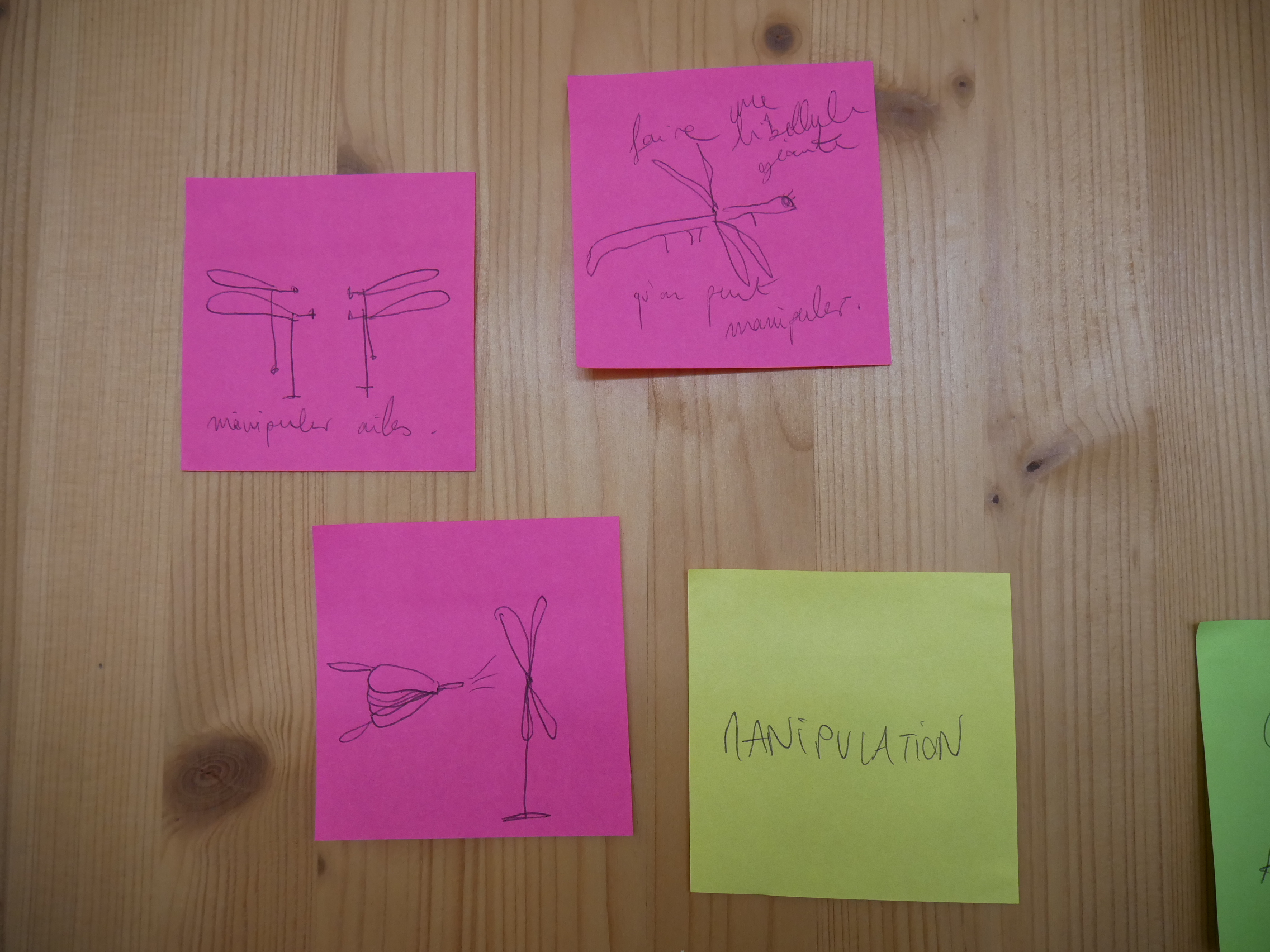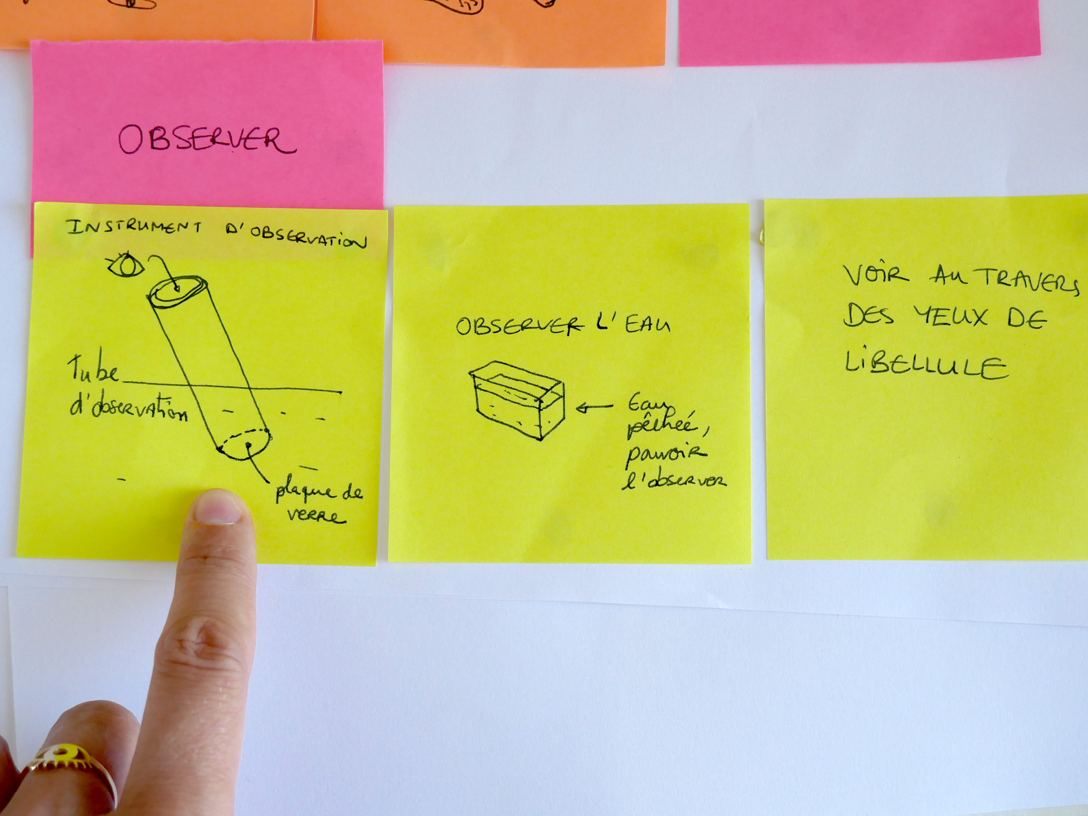 > Des idées folles : un périscope mais pour observer sous l’eau, une cascade, fontaine, un parcours pour se mettre dans la peau d’un animal, reproduire le bruit des animaux, des amplificateurs de son, les fourmis qui sont toutes petites mais qui déplacent de gros trucs, voir comme une libellule, etc.