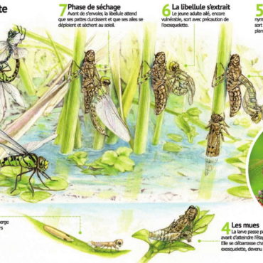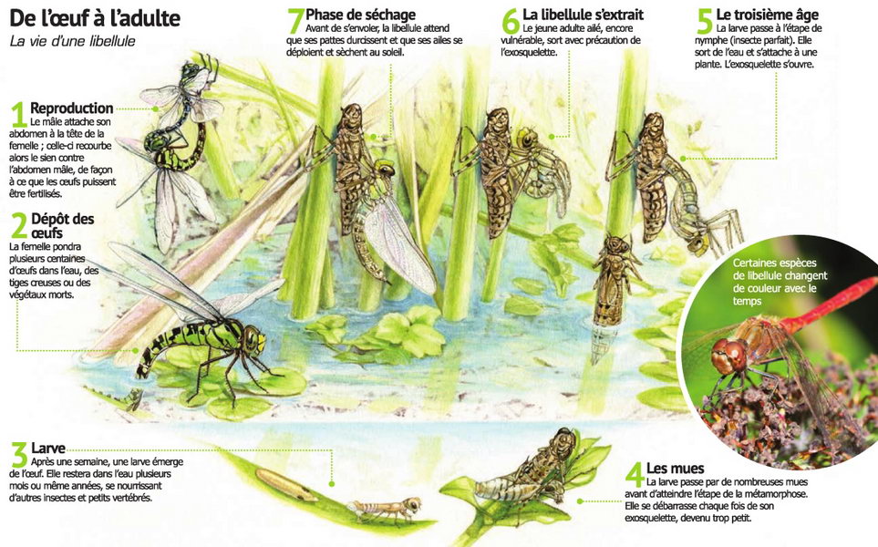 Aborder le cycle de vie de la libellule, avec ses métamorphose successives.