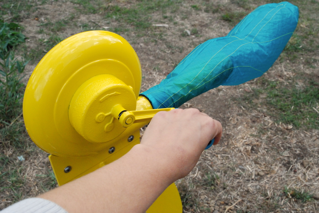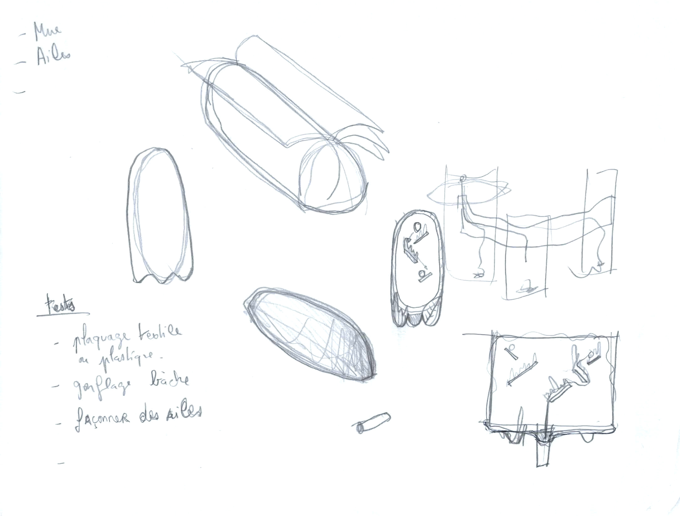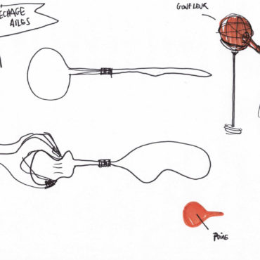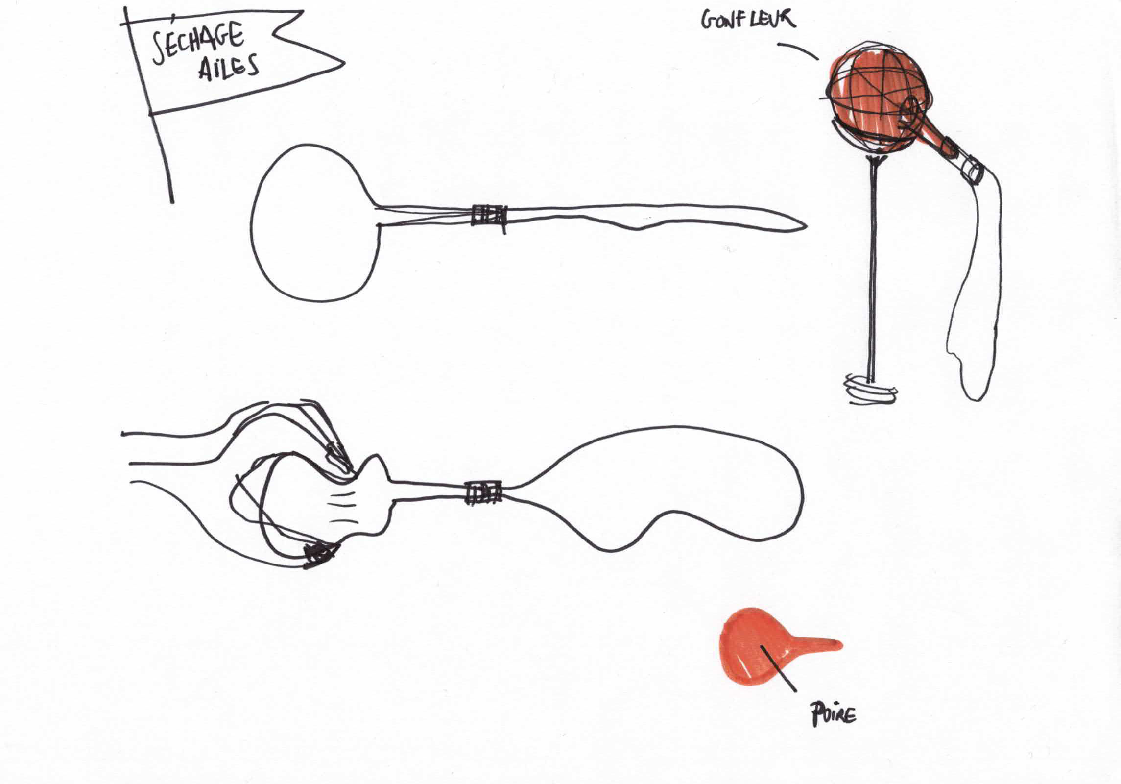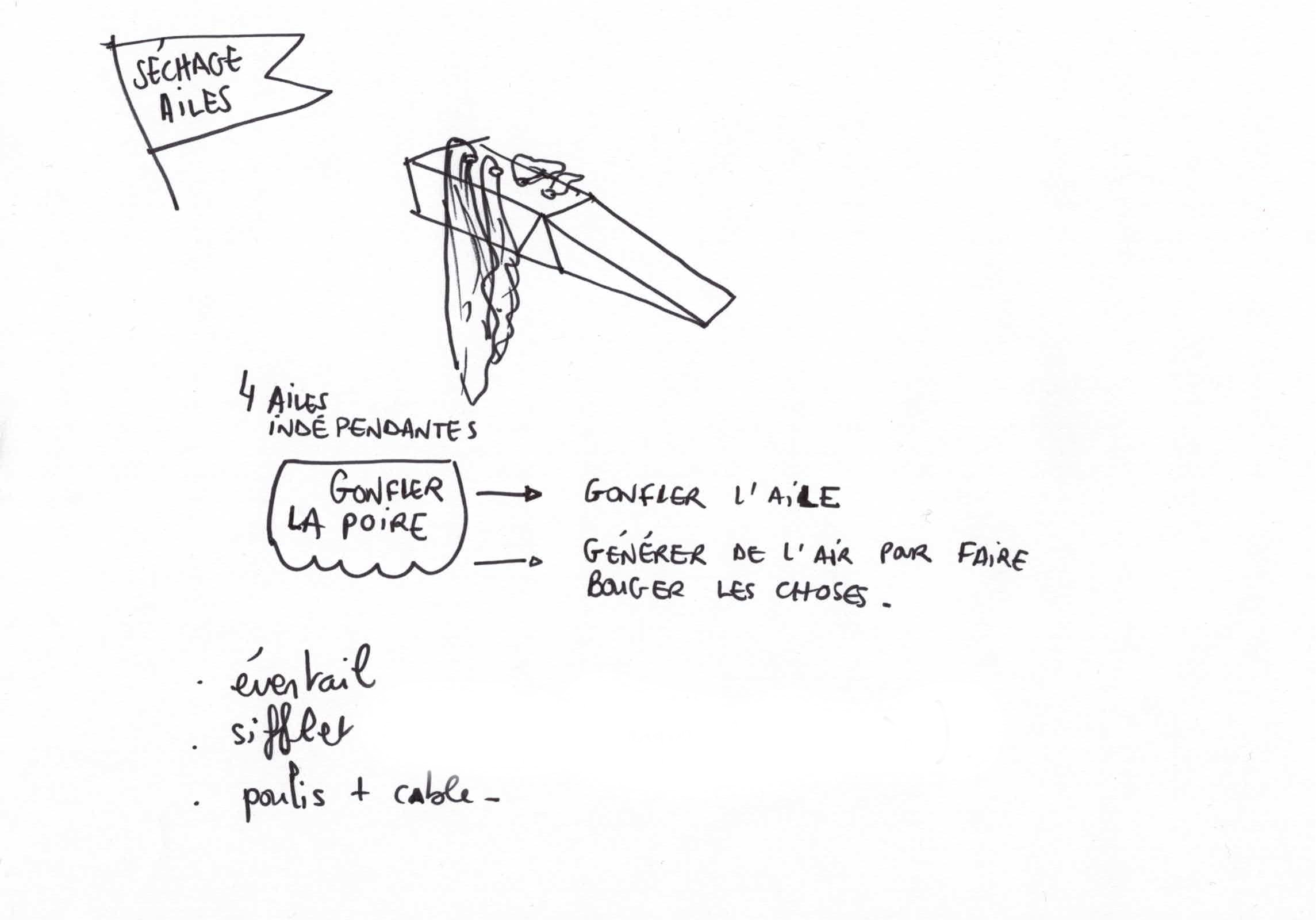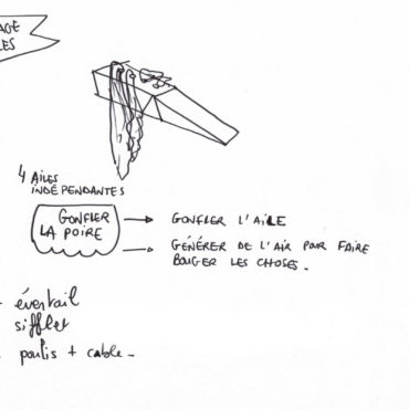 Pour cela, on a pensé à une aile (un manchon ?) qui pourrait être gonflé par la manipulation d’un objet souffleur (hélice, ventilateur, soufflet, …)