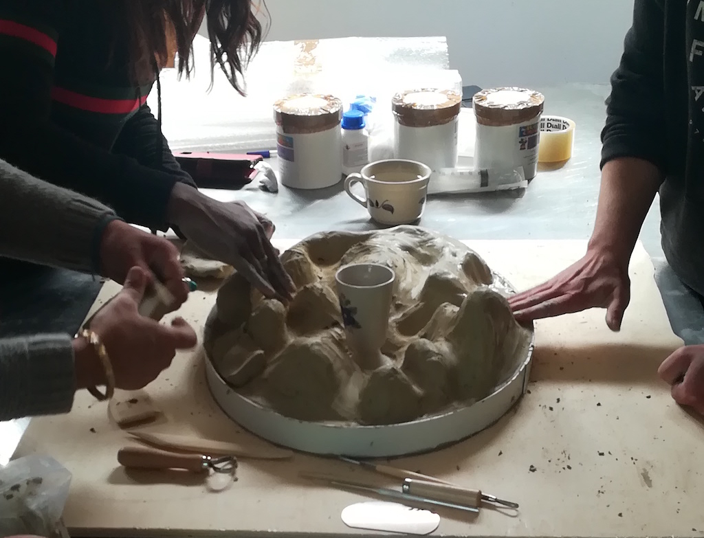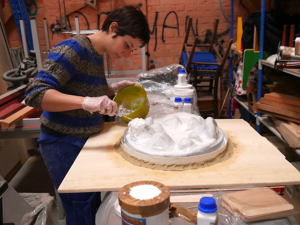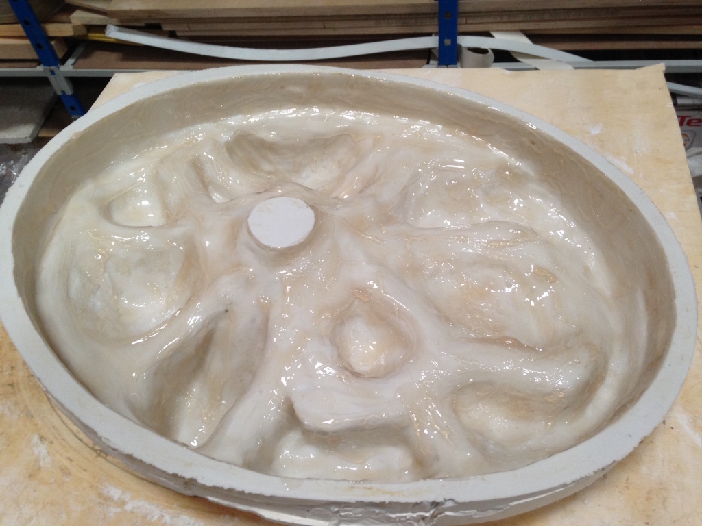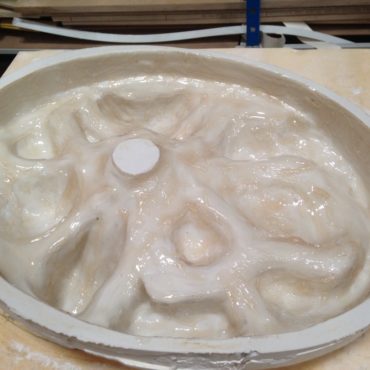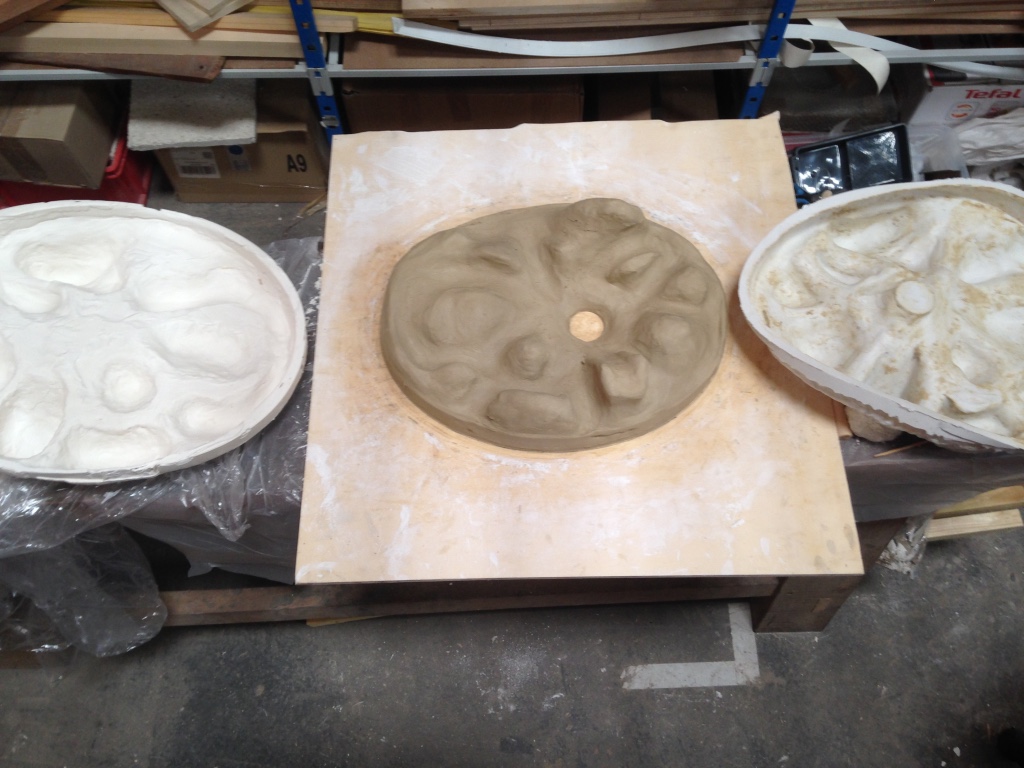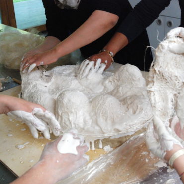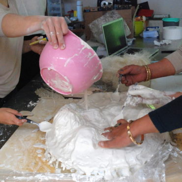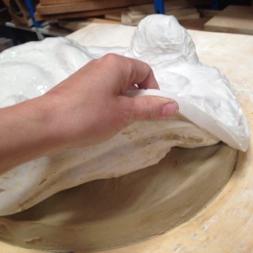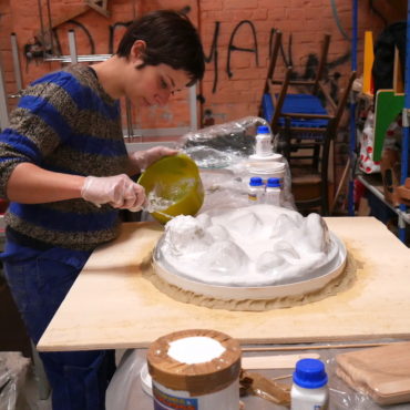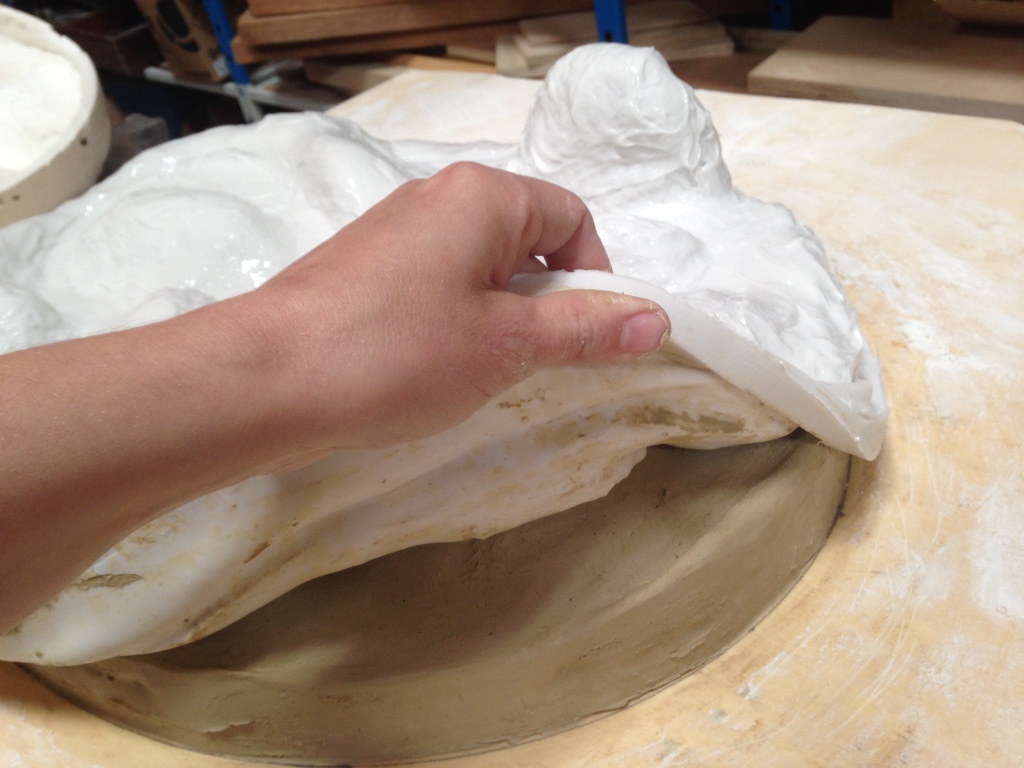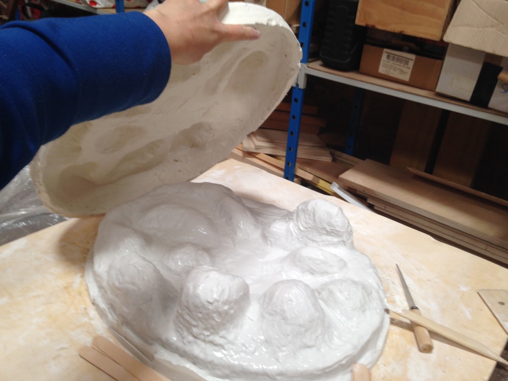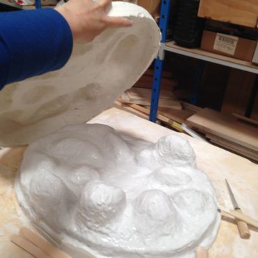 Suite de la fabrication du dispositif de ponte. Aujourd’hui, nous réalisons le moule du modèle en terre modelé la semaine précédente. On a déjà réalisé précédemment un moule-empreinte en silicone. En atelier, nous passons à la réalisation de la chape en plâtre qui servira à rigidifier le moule. Par la suite, nous ferons un tirage en résine de la forme.