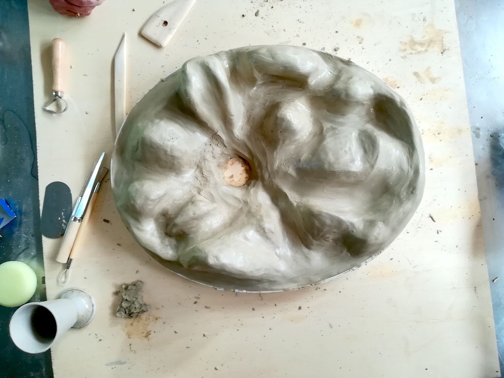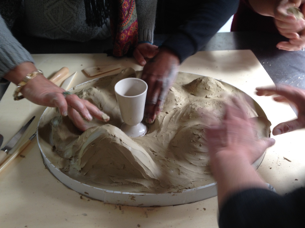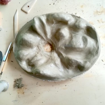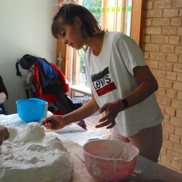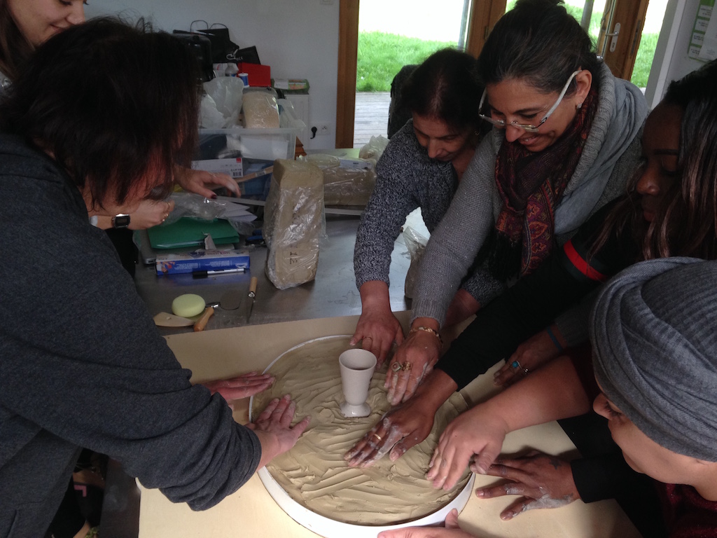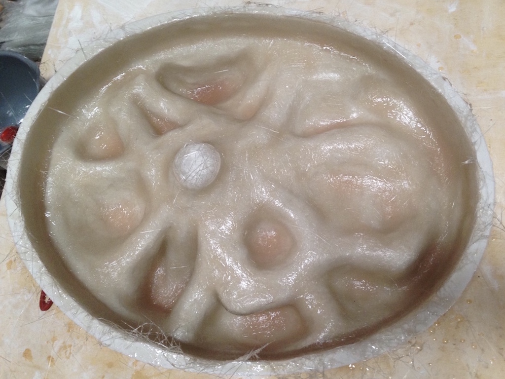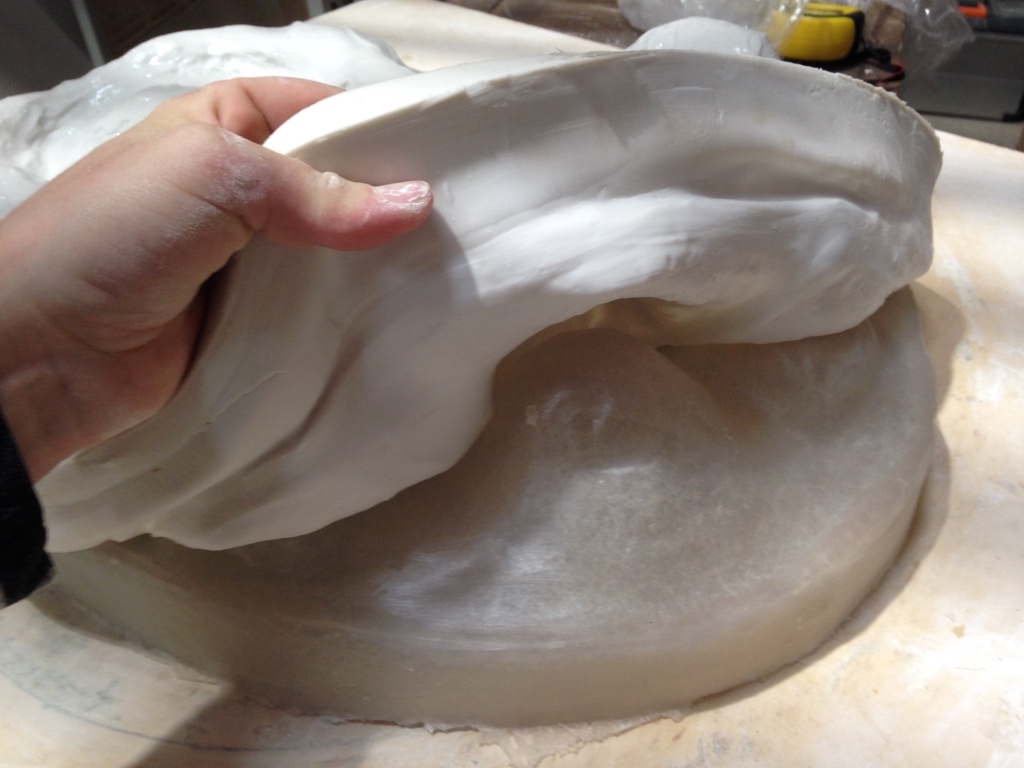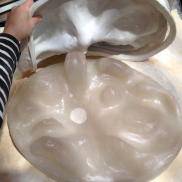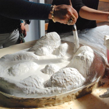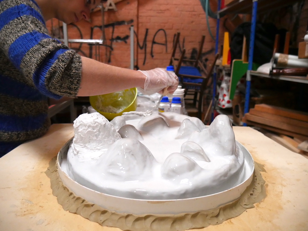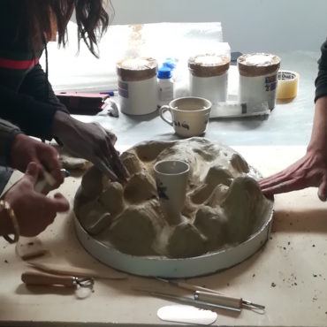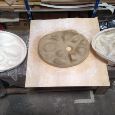 Suite de la fabrication du dispositif de ponte. Aujourd’hui, nous réalisons le moule du modèle en terre modelé la semaine précédente. On a déjà réalisé précédemment un moule-empreinte en silicone. En atelier, nous passons à la réalisation de la chape en plâtre qui servira à rigidifier le moule. Par la suite, nous ferons un tirage en résine de la forme.